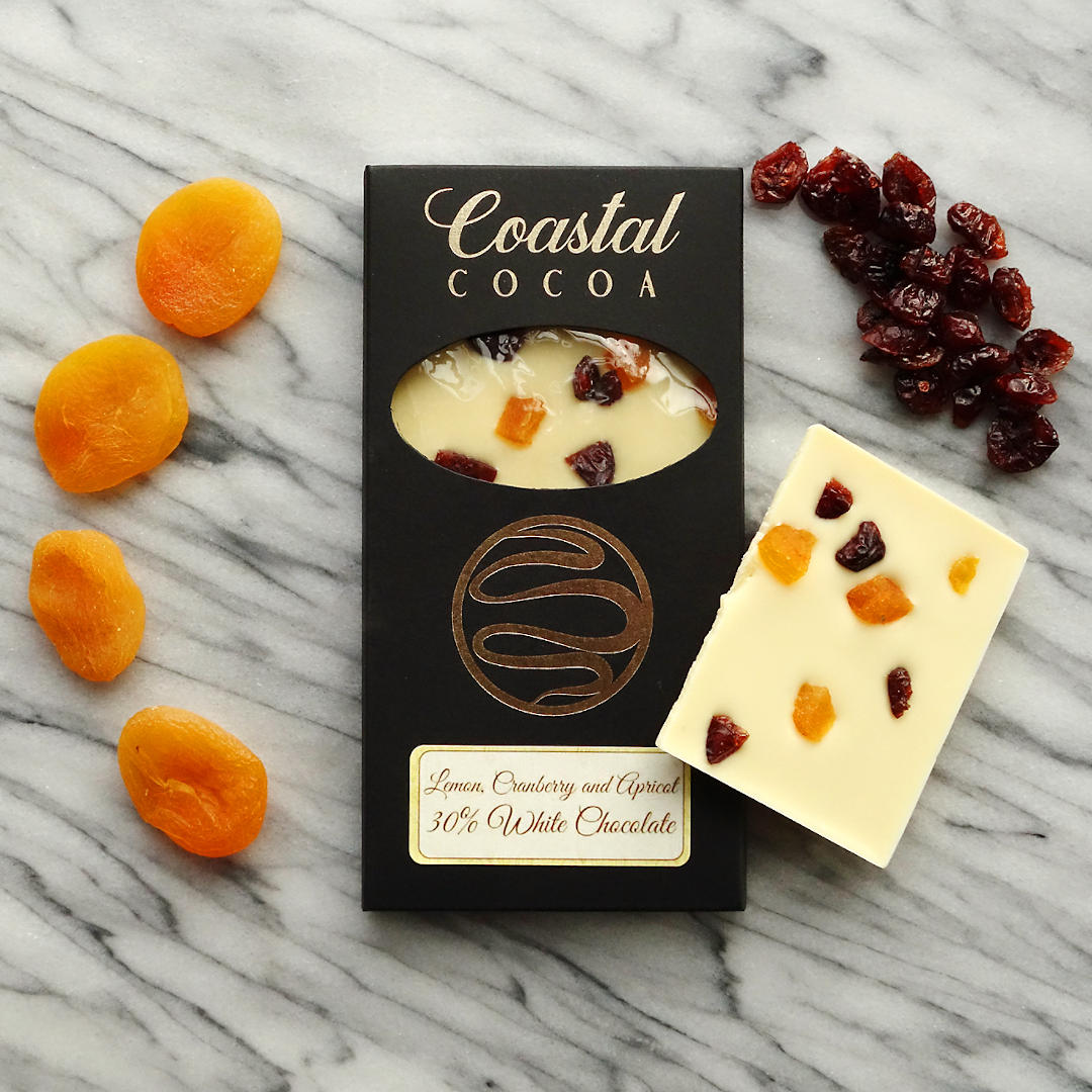 Ingredients - White Chocolate contains minimum 30% cocoa solids (sugar, cocoa butter, whole milk powder, soy lecithin, vanilla), Dried Apricot (apricot, sulphur dioxide), Dried Cranberry (cranberry, apple juice, sunflower oil), Lemon Essential Oil