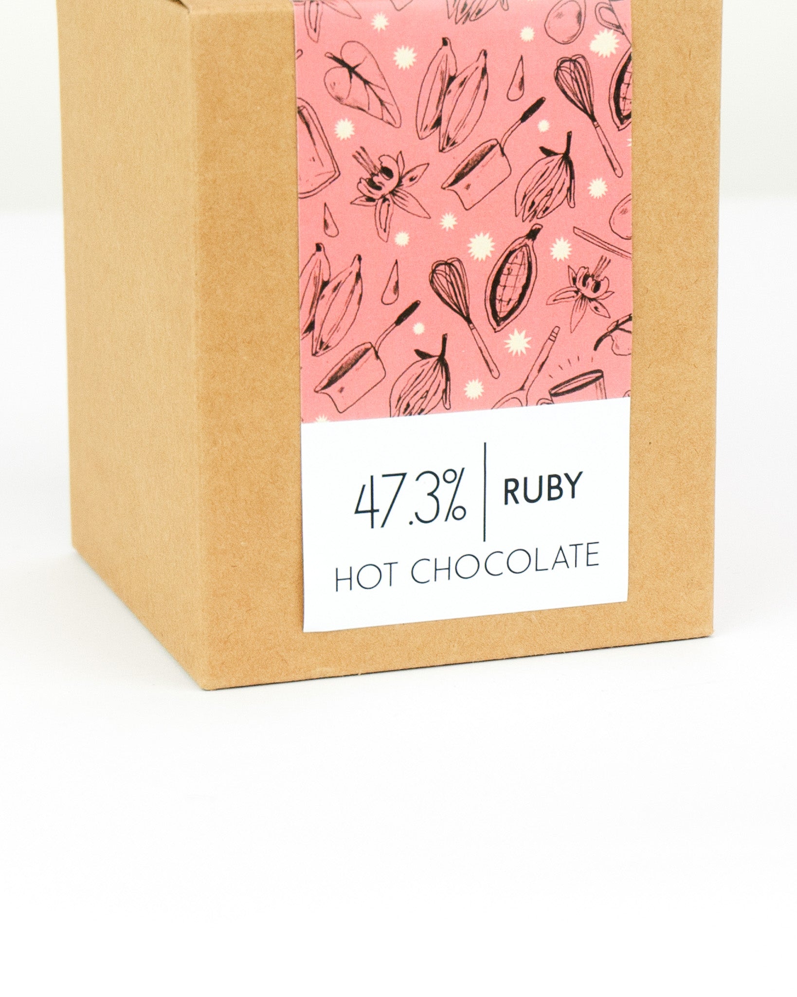 Ruby Chocolate (sugar, cocoa butter, skimmed milk powder, whole milk powder, cocoa mass, emulsifier: soya lecithin, citric acid, natural vanilla flavouring). Cocoa solids 47.3%.