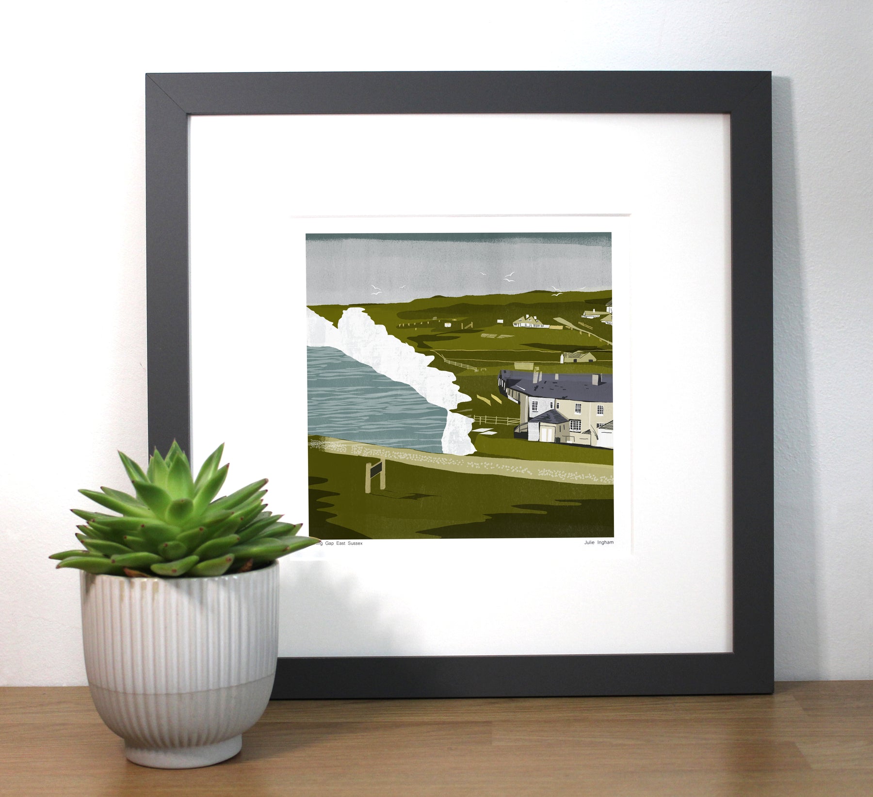 Birling Gap: this Giclee print is beautifully printed on Bockingford Watercolour 190gsm Paper, using ChromaLife 100+ quality ink. The print is window mounted using an off white shade of mountboard. The window size of the mount is 20cm x 20cm. Framed using a high quality classic grey frame. With shatterproof styrene glazing. The external measurement of the frame is 36cm x 36cm. Frame width may vary slightly from image. Framed prints are posted in tissue, bubblewrap, card and brown paper to allow for safe delivery.
