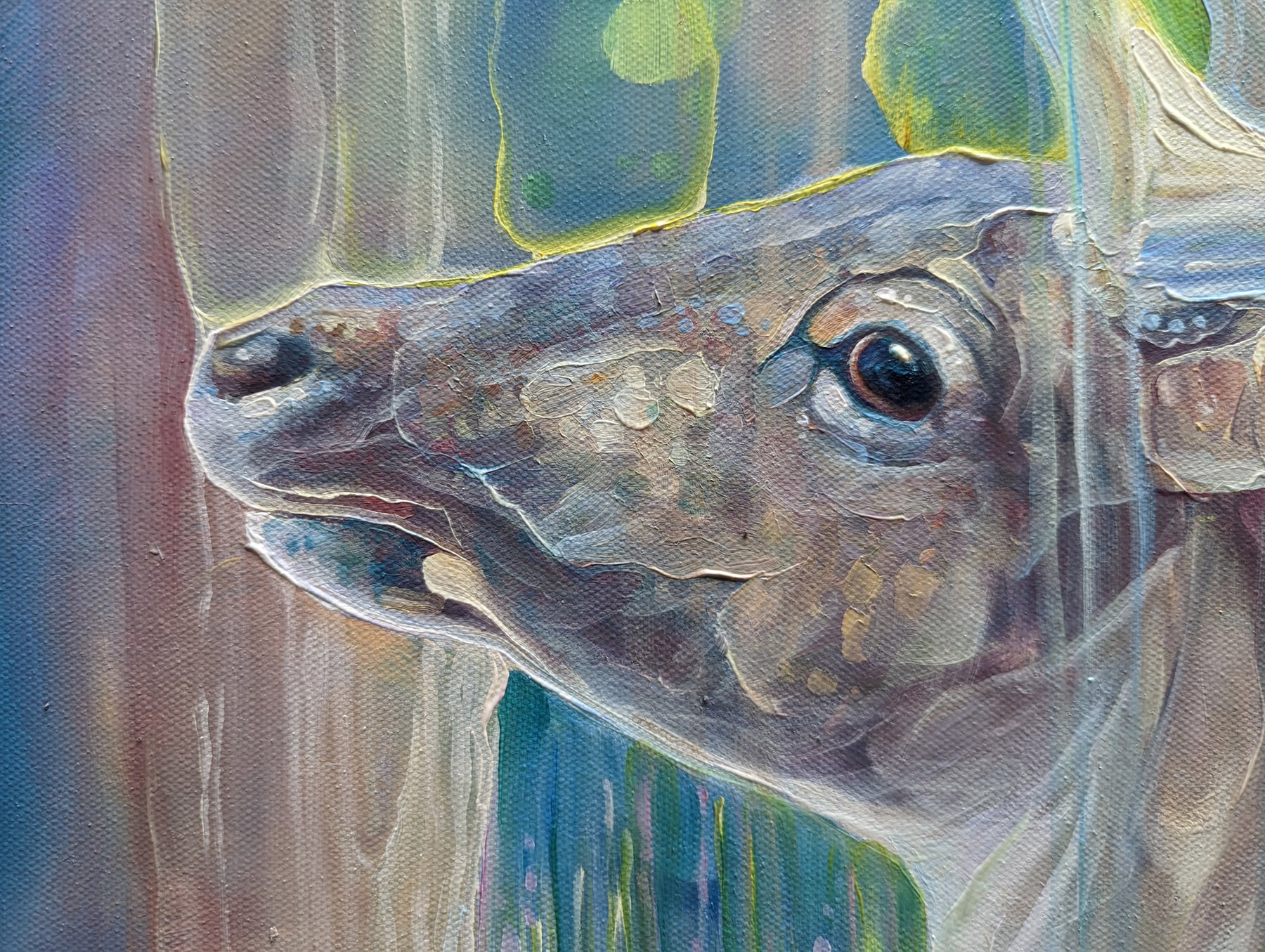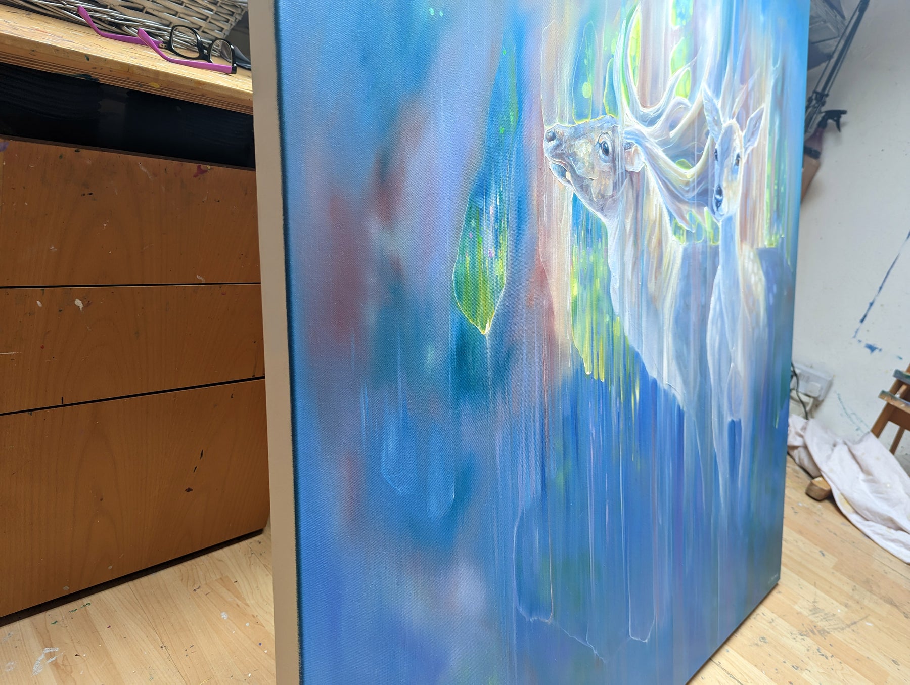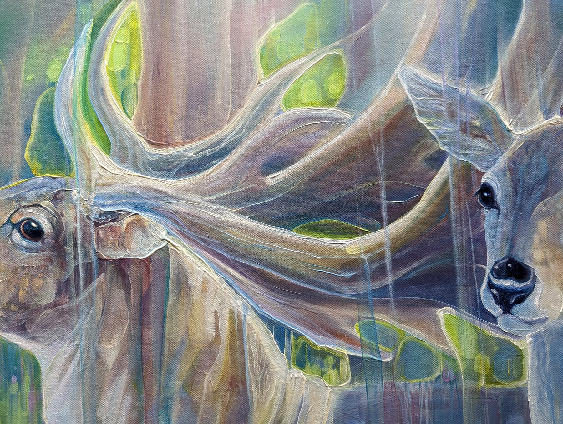Divine Monarchs is a large semi-abstract wildlife painting of two deer in a bluebell wood in springtime. It is 48x48x1.5 inches. The painting was inspired by the months of April and May when the woodlands become carpeted in bluebells. I rarely spot deer in the forests as deer hide expertly, but in springtime it is easier to see them against the blues, lilacs and pinks of the flowers. I began the painting thinking to make a traditional portrait of a stag and a doe but found it impossible. Deer are just too ethereal and I am too inclined to try and capture the spirit of them rather than the anatomical accuracies - so this is what happened. The painting shimmers with the life and energy of the universe under trees and I have made the most of the interplay between sun and shade by contrasting the blue and lilacs of the shadows against the yellows, pinks and greens of the sun dappled scene. Painted on deep edge canvas, edges white, ready to hang, no frame needed. Comes with certificate of authenticity. https://www.youtube.com/watch?v=nSq-3wRMCnY