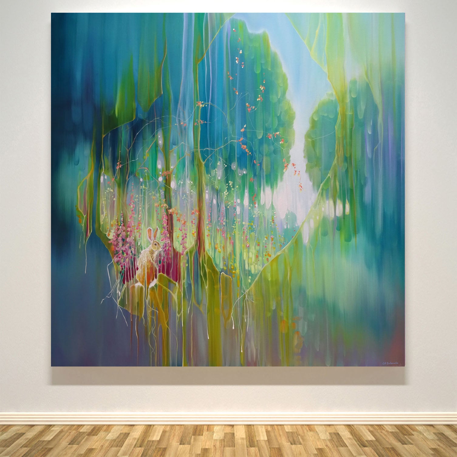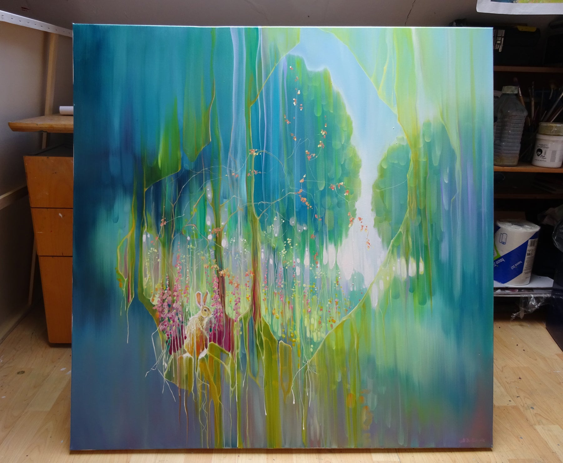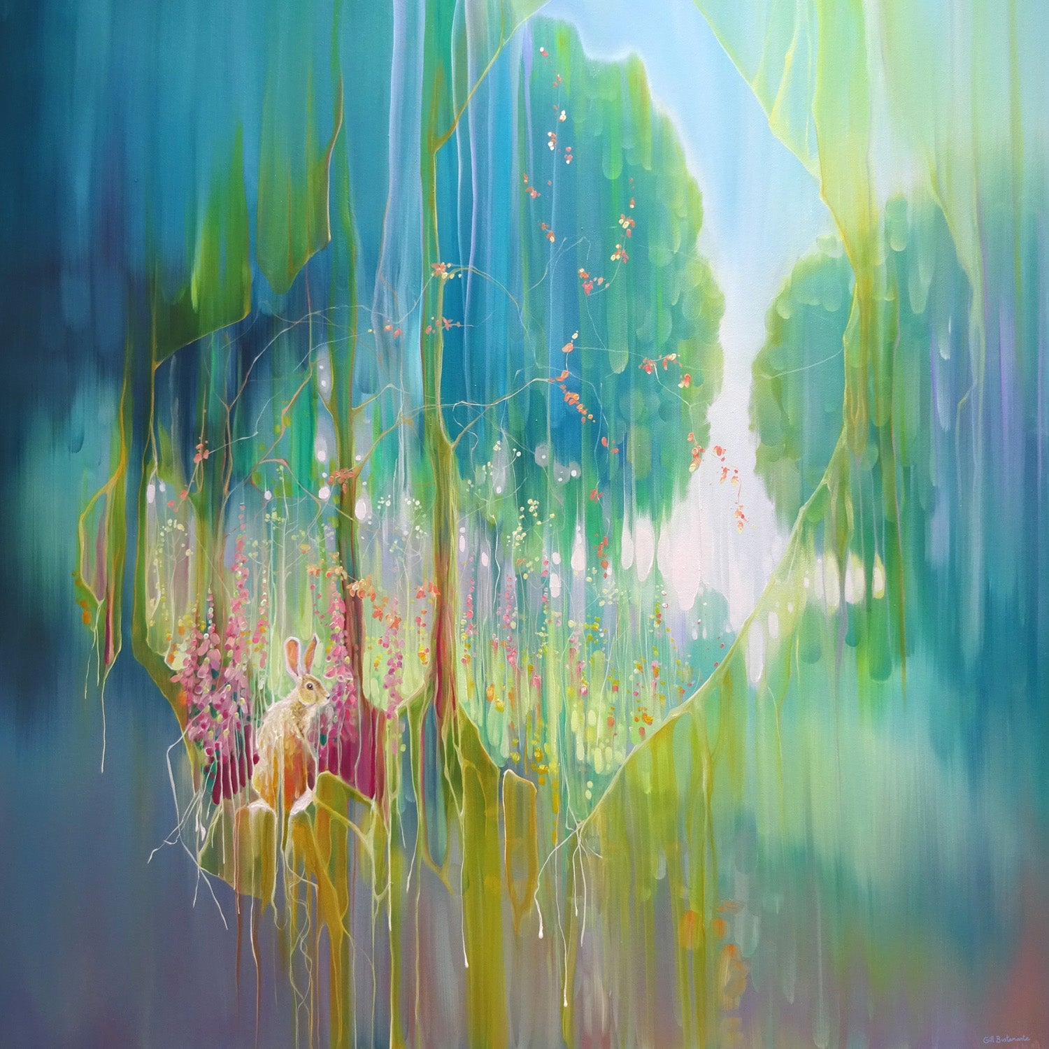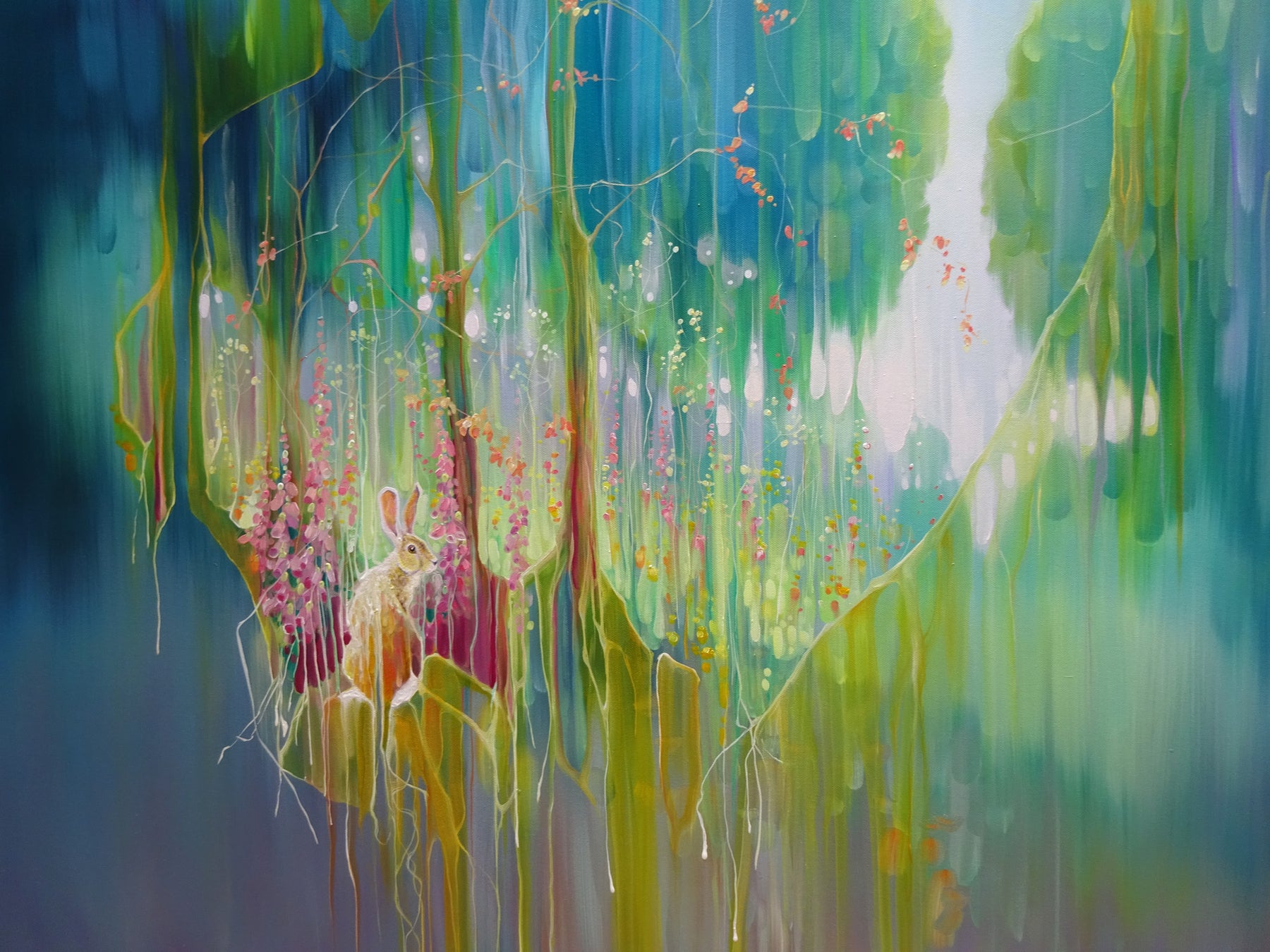 Hares Meadow is a 40x40x1.5 inches oil painting on canvas of a yellow hare beside a meadow of trees and wildflowers. The style is contemporary art nouveau and is very colourful. The hare sits to the left and looks back at us. She is generously showing us a glimpse of her realm with its trees and flowers and possibilities and the idea of veils or curtains being drawn back makes it a little dreamlike. I have only ever seen one hare in real life and I was struck by how beautiful it was whilst at the same time being so strangely awkward. I can totally see why they often feature in fairy tales and legends about magic. The background of the painting has been blended and blurred whilst the foreground paint is thicker with more definite brushstrokes. This adds to the slightly ethereal feeling of it. Like all my artwork, it is a tribute to nature and an invitation to humans to cherish and protect it. It is dedicated to all those who are doing just this. It is painted on wide edge canvas, no frame needed, ready to hang, white edges. Video: https://www.youtube.com/watch?v=F7ztDtEJqsk