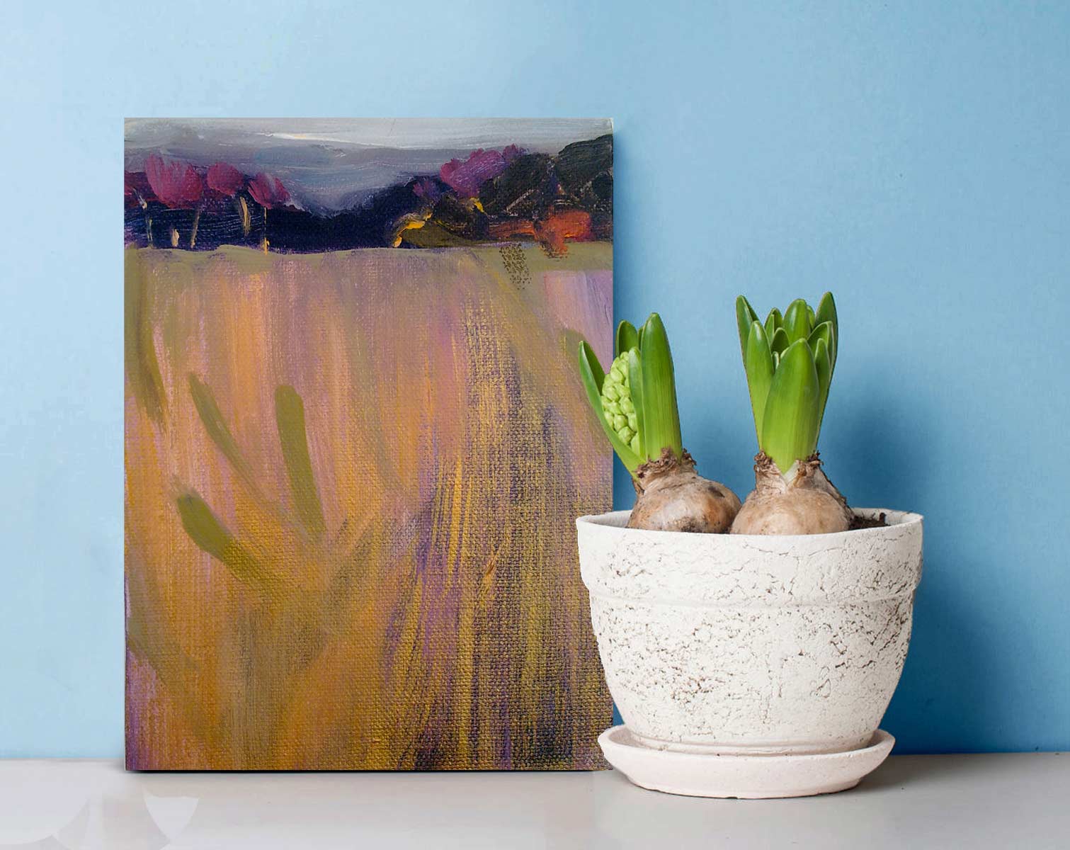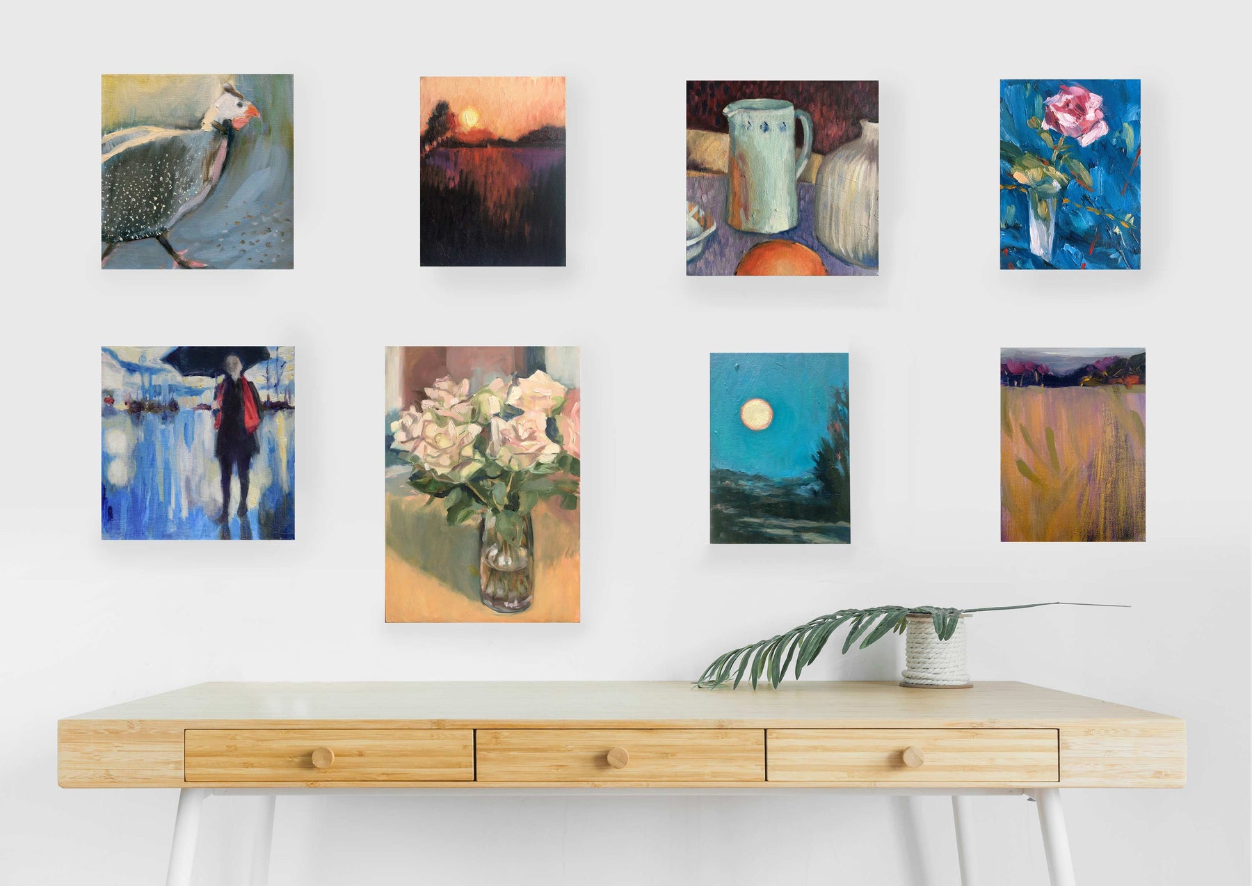 Painted in oil on deep edged stretched canvas, 20 x 15 x 2.5cm, strung and ready for hanging.