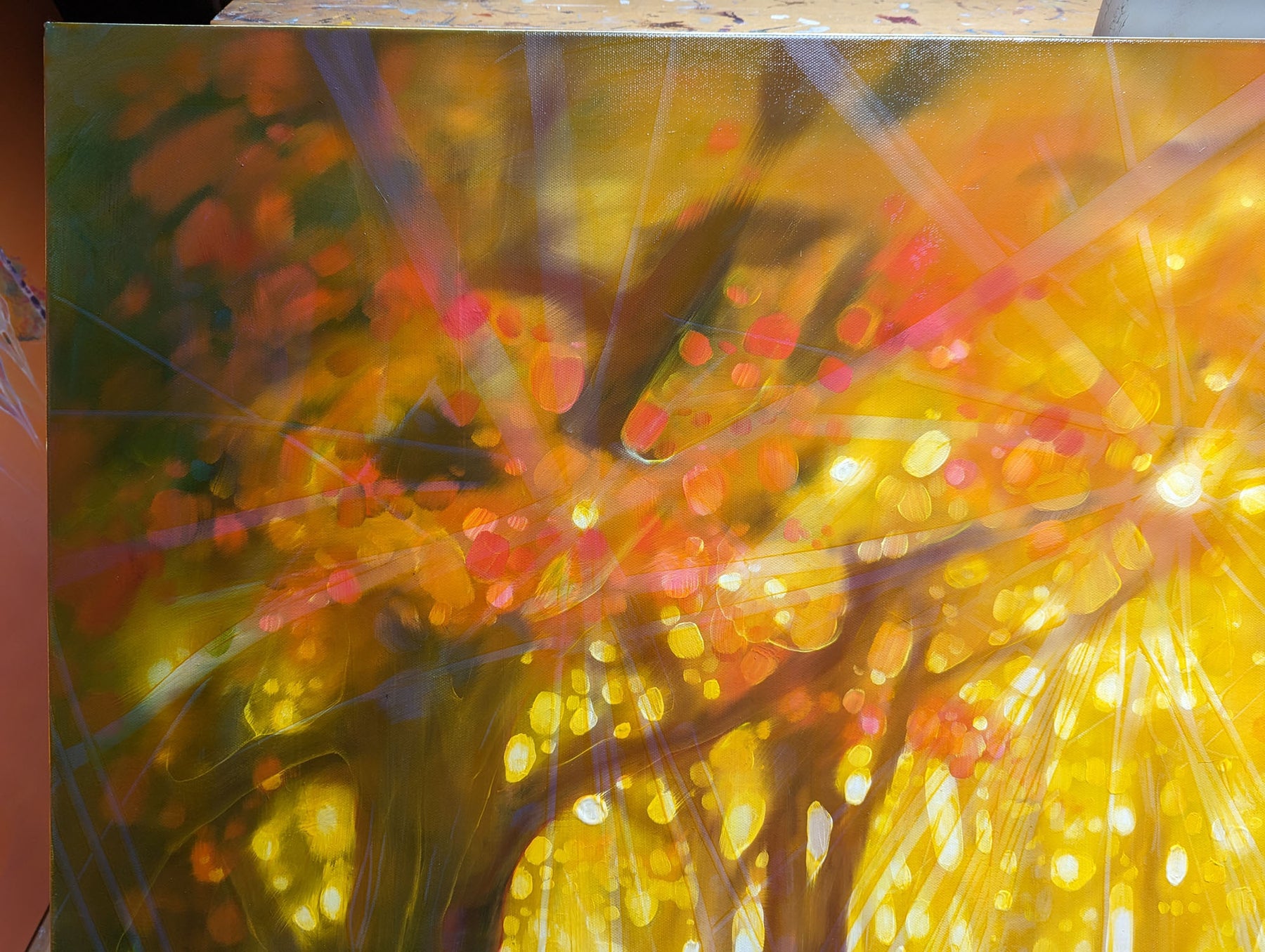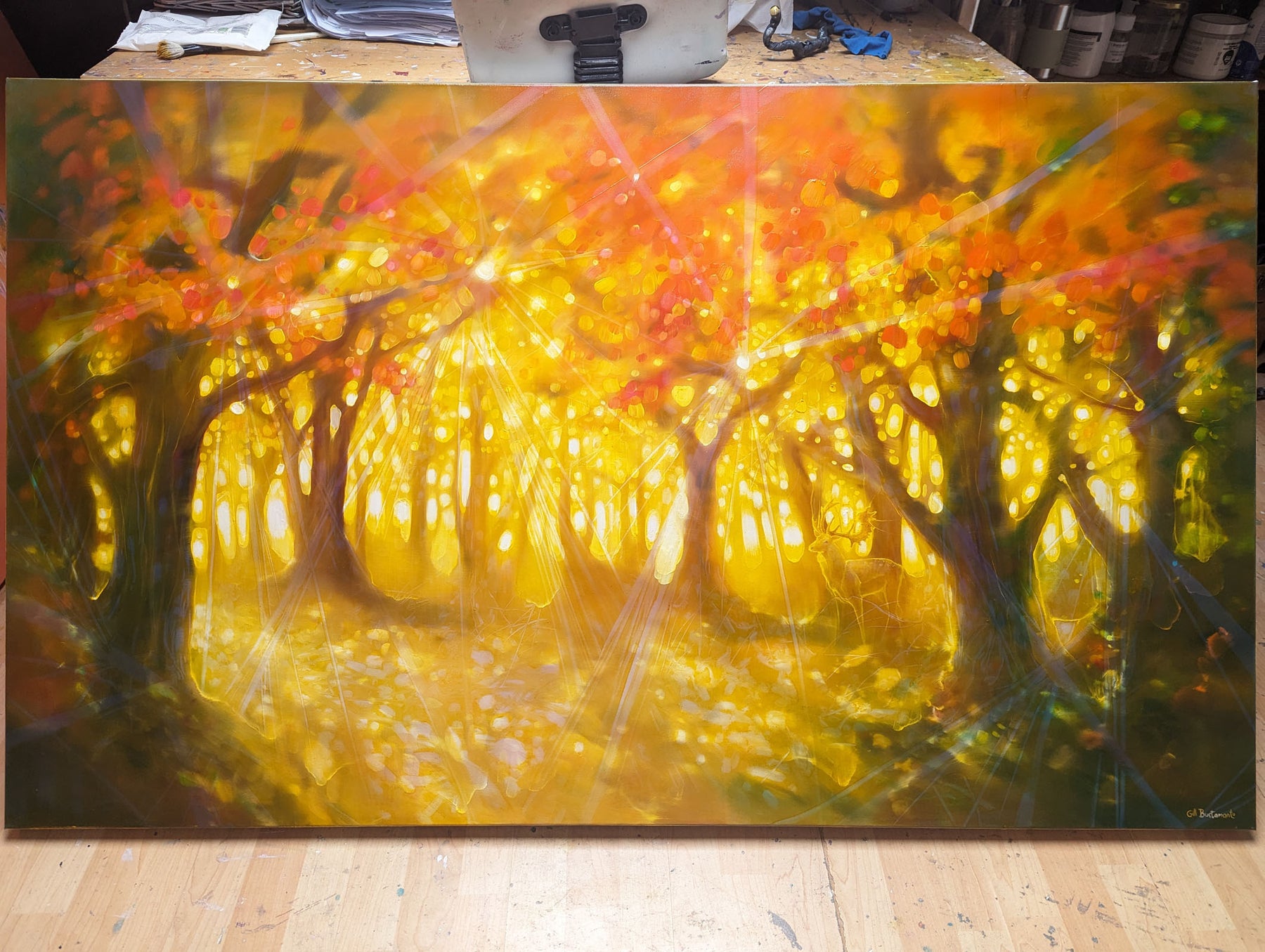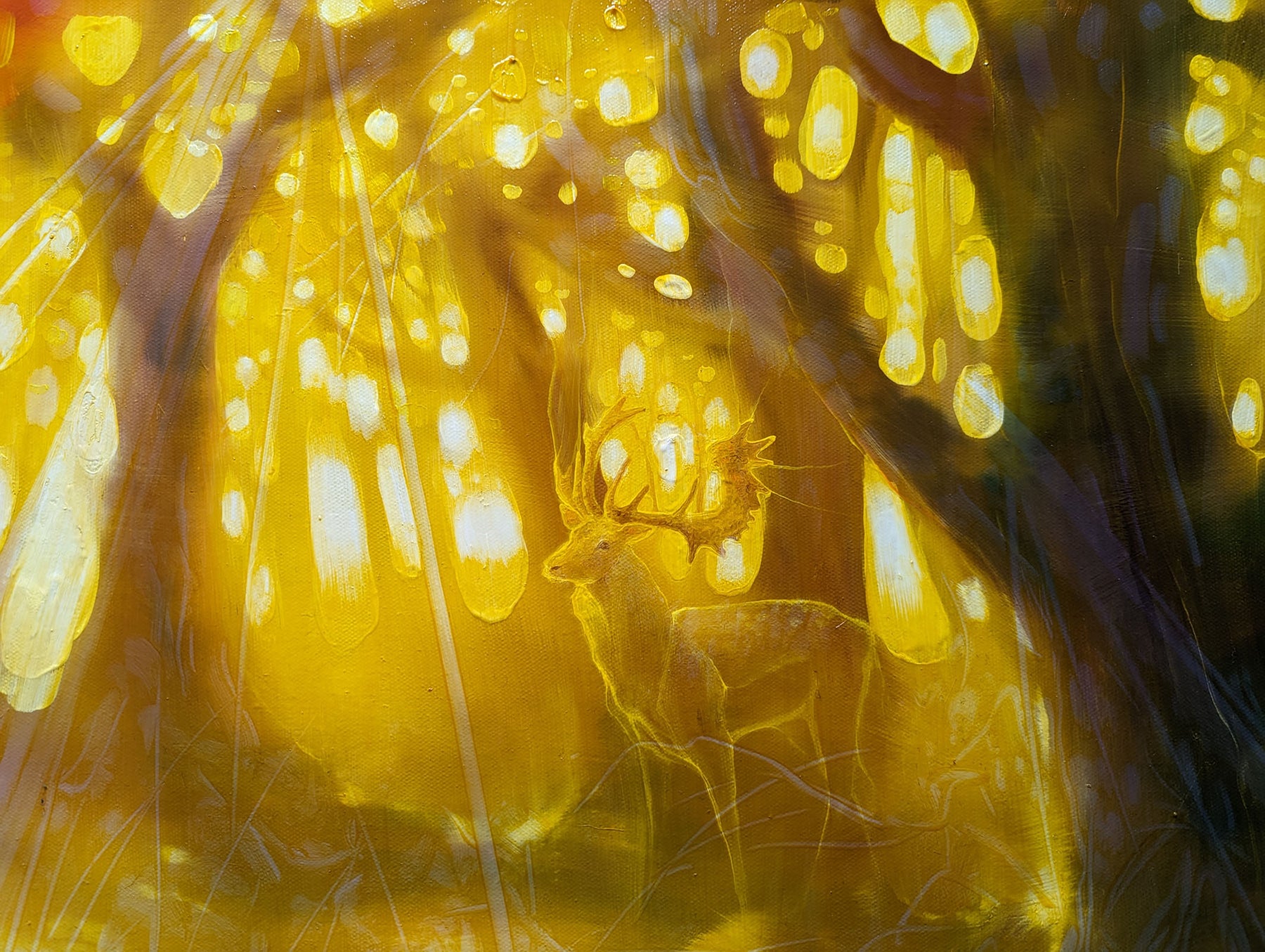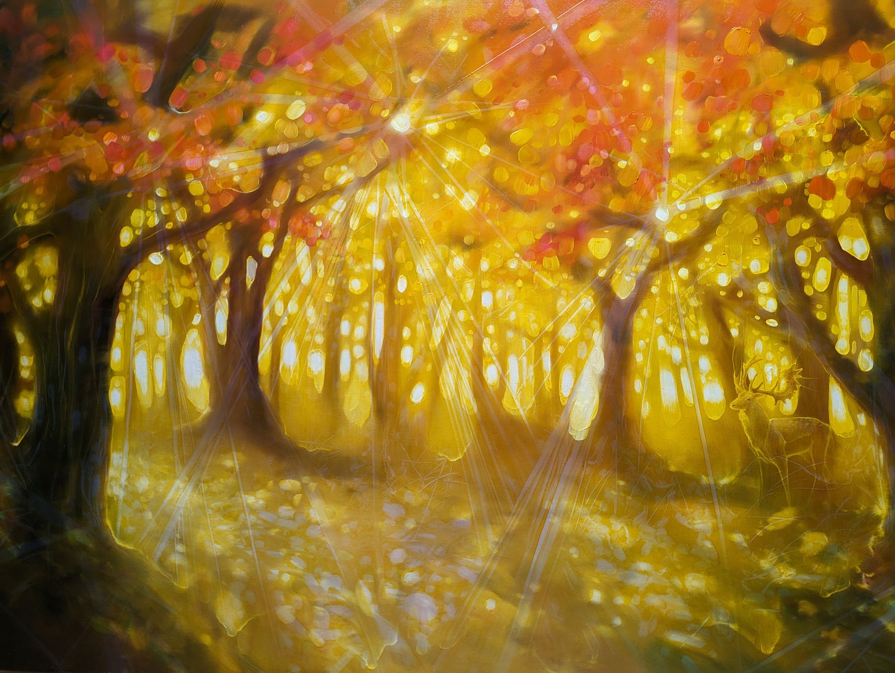 Natures Cathedral is a very large golden oil painting of an autumn forest clearing. It is 60x36x1.5 inches. The painting shows the view into a clearing along an autumn path with a semi-transparent deer stag just visible on the left. The style is semi abstract and contains the full range of vibrant autumn colours but with a golden hue across them. There is also the hint of beams of light shining thought the trees at many different angles and that helps create a feeling of energy and something otherworldly. The painting was inspired by various woodland walks taken in the Sussex area and the odd glimpse of deer in them. I am sometimes struck by how woodland paths are almost spiritual in the feeling they give off – hence the name. Forests are nature’s cathedrals. You can often feel you are being observed in forests and I like the how different forests evoke different emotions. Some are welcoming, some are just barely tolerating your interruption and some are actually quite sinister. This painting is a big welcoming glowing forest. Painted on deep edge canvas, edges white, ready to hang, no frame needed, comes with certificate of authenticity.