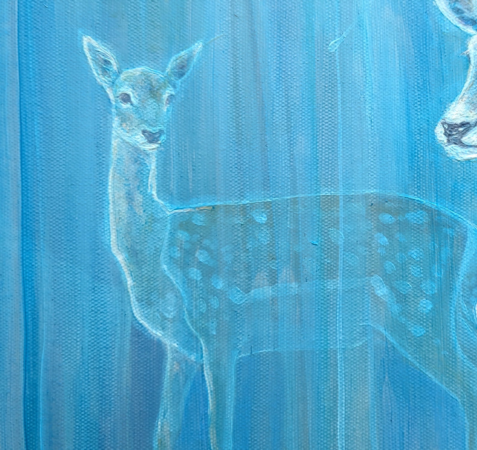 Out of the Blue is a large blue abstract painting with two female deer emerging from a beautiful blue universe. It is 40x40x1.5 inches. This is an unusual painting as it appears to be mostly blue. However, when the light changes, you will see many other colours ranging from pinks, purples, yellows and tans that only show when viewed from different angles - almost like the iridescent feather of a bird. The inspiration for the painting was simply to pay tribute to the beauty of female fallow deer but developed into something more abstract as more layers of paint were added. It is highly textured and hints at a woodland that the deer are coming from. I like to think that deer are magical beings and the intensity of the blue adds to that feeling. I have attached a ‘before and after’ of the blue paint so you can see how it changed. It is painted on deep edge canvas, blue edges, ready to hang, no frame needed.