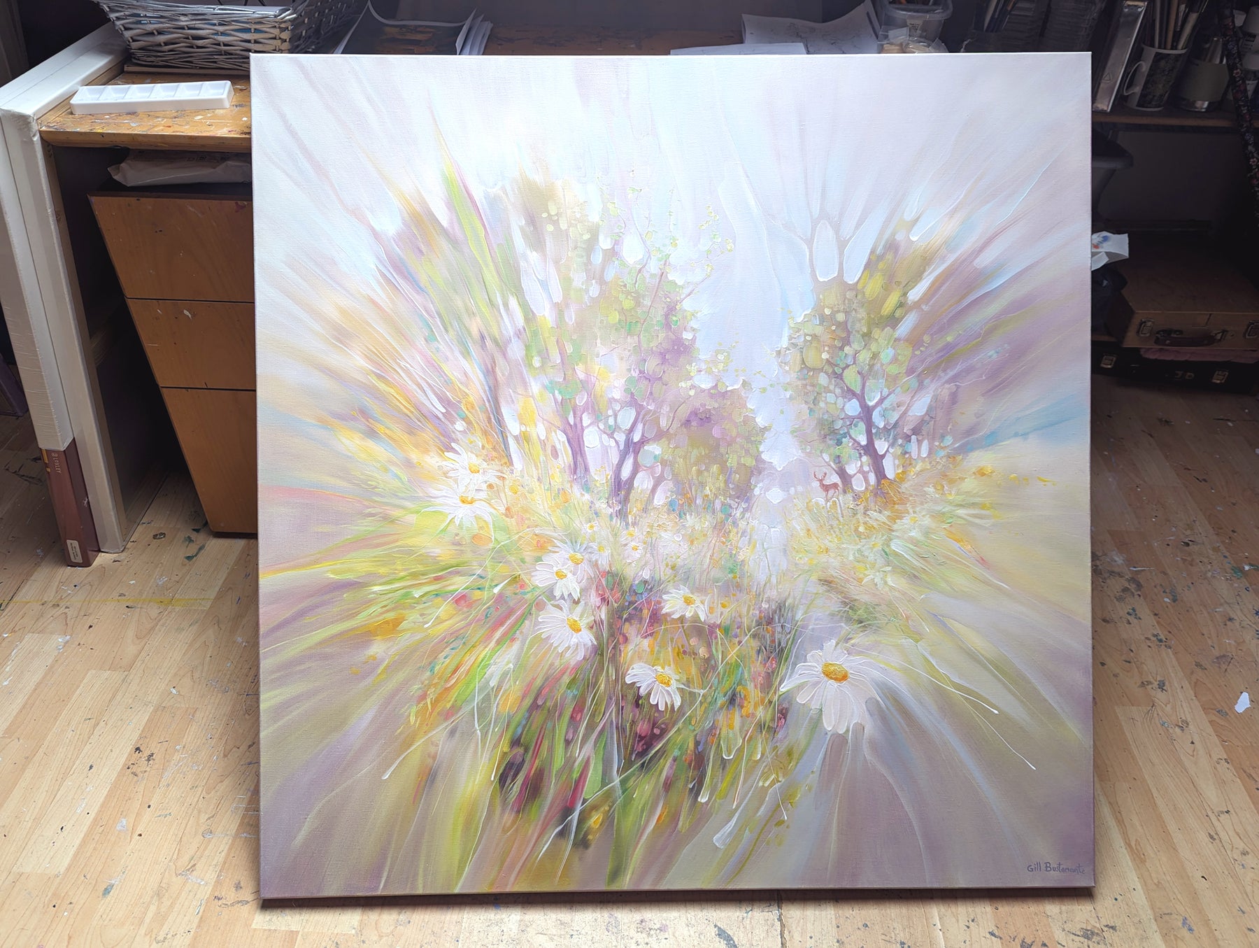 Spirited Away is a semi-abstract explosion of a landscape showing daisies in a summer meadow. It is 40x40x1.5 inches. The daisies are seen in a meadow with trees behind them and a stag can be seen watching in the distance. He is ready to spirit away anyone who wants to follow him (a reference to the fact that deer are often seen as spiritual guides or messengers in more than one culture). There is a suggestion of a path that leads up to the trees. The colours are white, lilac, grey, yellows, orange and soft pinks. The landscape is bursting out from the centre of the painting in a joyous whoop of happy summer celebration as I tried to show the exuberance of summer and the way that nature splurges on the season. Painted on Deep edge canvas, white edges, ready to hang, no frame needed. Comes with certificate of authenticity. Video: https://www.youtube.com/watch?v=9vkEUipZ9os