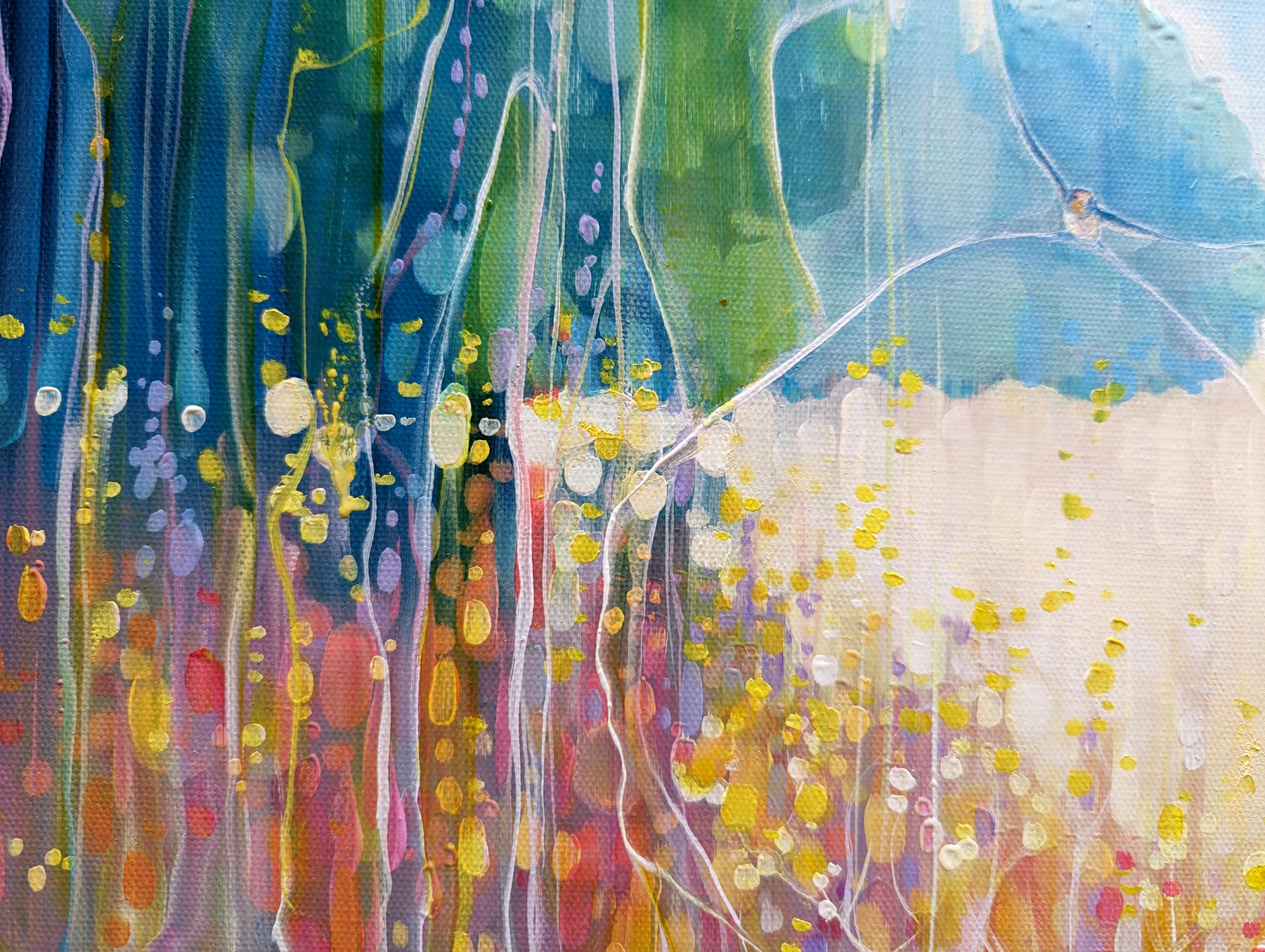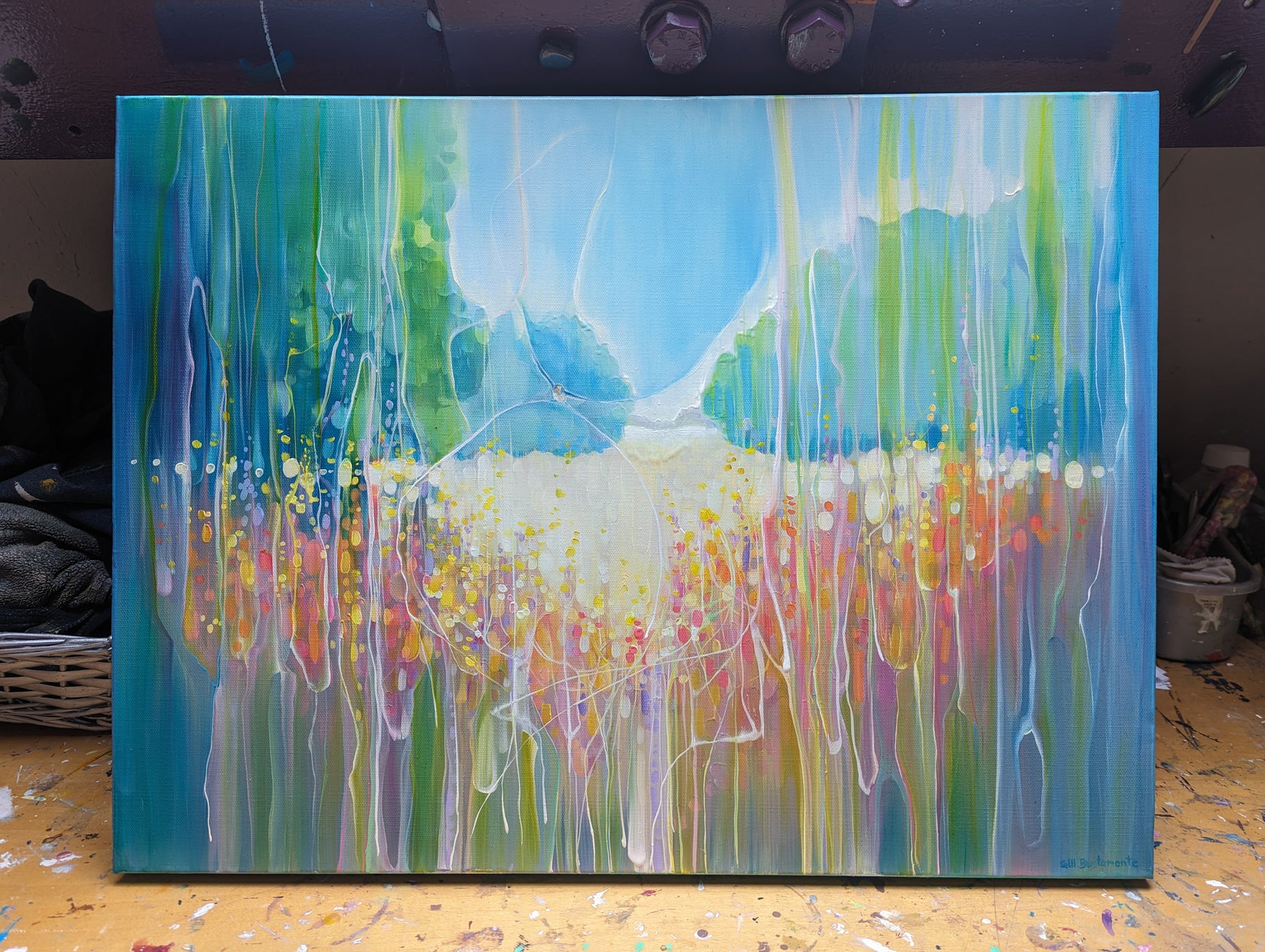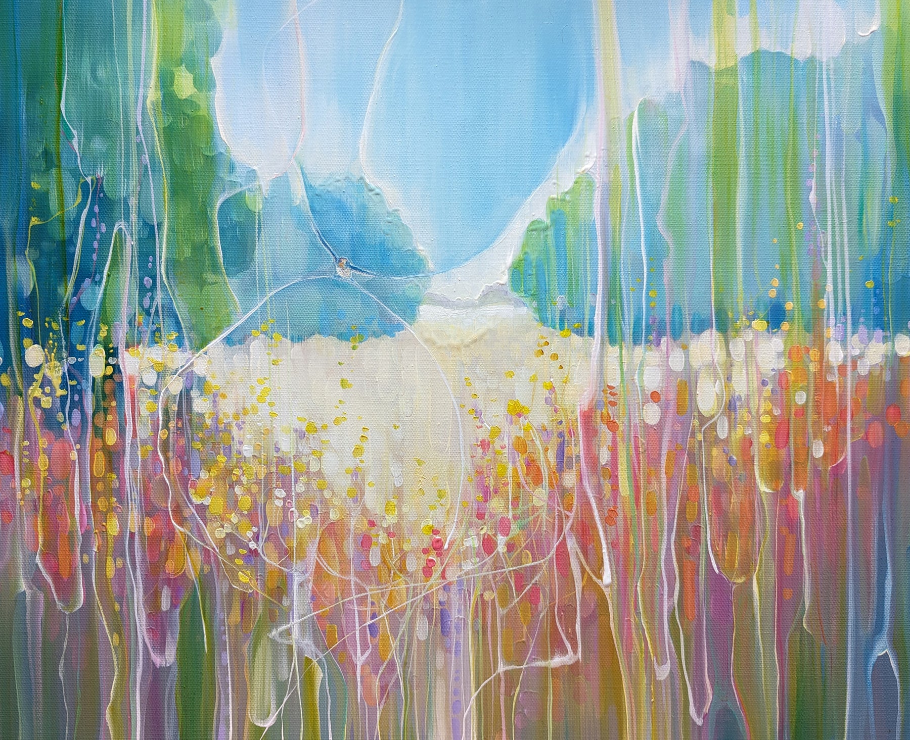 Summer Vibrates is a colourful semi-abstract landscape oil painting of a summer meadow and a swallow. It is 24x18x1.5. It is art nouveau and semi abstract in style and very vibrant in colour. A swallow is swooping over the meadow and below her there are fields of wheat with wild flowers edging the fields. It was inspired by swallow watching over a field near where I live. There is a shallow valley where in summer heat haze the swallows gather insects over the flowers and wheat fields. This little painting sums up a specific happy moment for me from August a few years ago. It is part of a series of paintings that try to capture the exuberance of Sussex fields and farmland in the summertime. Swallows feature often in my paintings as they are quite simply beautiful little birds and are only in the UK for the summer so it is a happy thing to see them. The painting is ready to hang, has white edges and does not need a frame. Video: https://www.youtube.com/watch?v=1GLBLmbRgXk