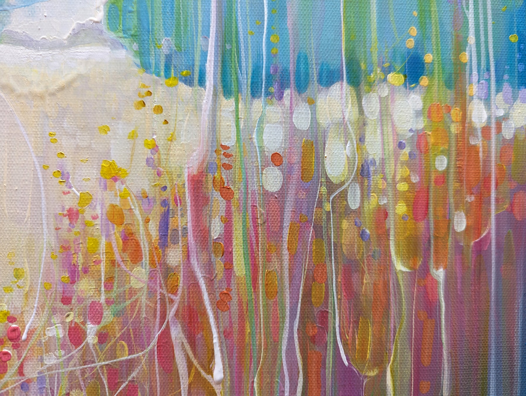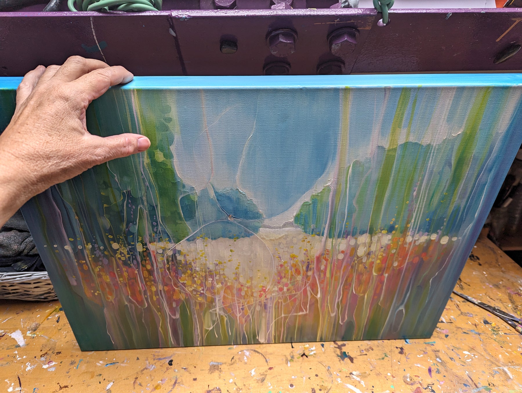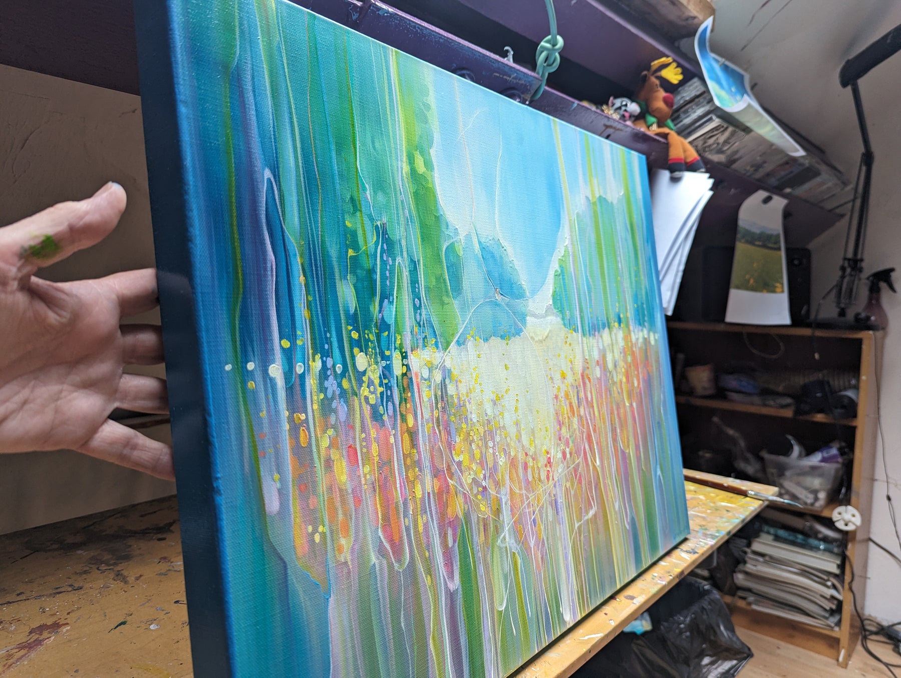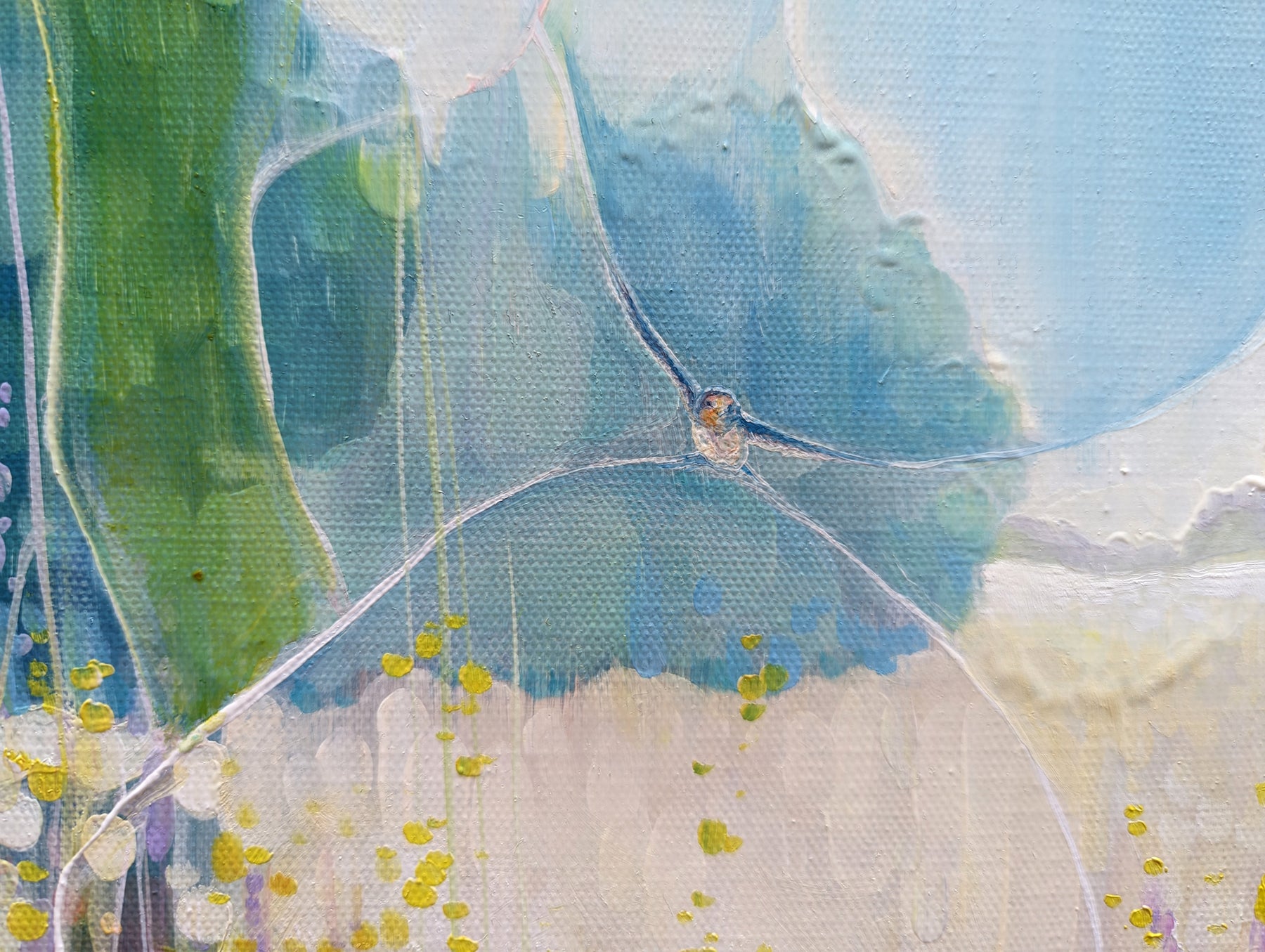 Summer Vibrates is a colourful semi-abstract landscape oil painting of a summer meadow and a swallow. It is 24x18x1.5. It is art nouveau and semi abstract in style and very vibrant in colour. A swallow is swooping over the meadow and below her there are fields of wheat with wild flowers edging the fields. It was inspired by swallow watching over a field near where I live. There is a shallow valley where in summer heat haze the swallows gather insects over the flowers and wheat fields. This little painting sums up a specific happy moment for me from August a few years ago. It is part of a series of paintings that try to capture the exuberance of Sussex fields and farmland in the summertime. Swallows feature often in my paintings as they are quite simply beautiful little birds and are only in the UK for the summer so it is a happy thing to see them. The painting is ready to hang, has white edges and does not need a frame. Video: https://www.youtube.com/watch?v=1GLBLmbRgXk