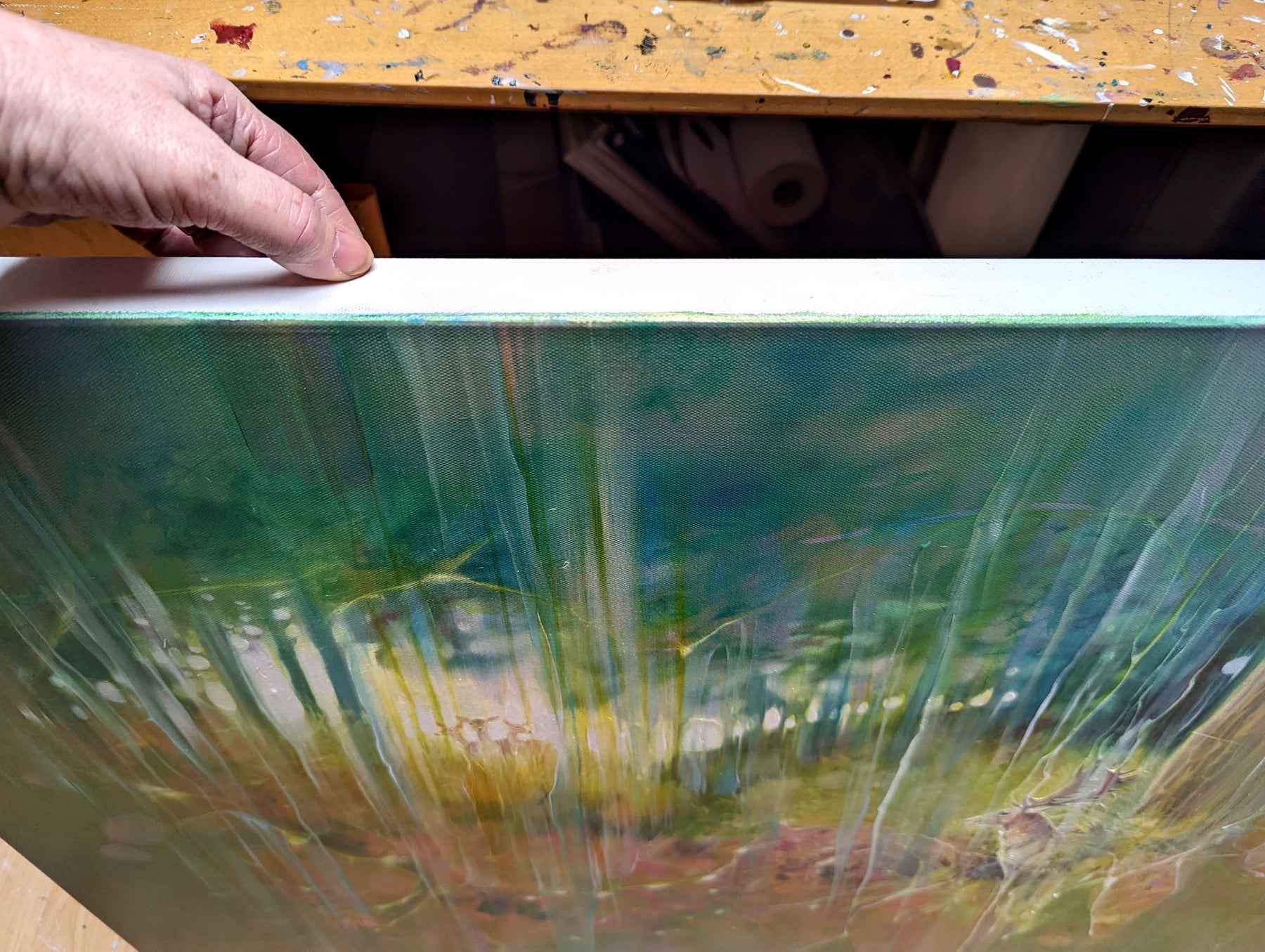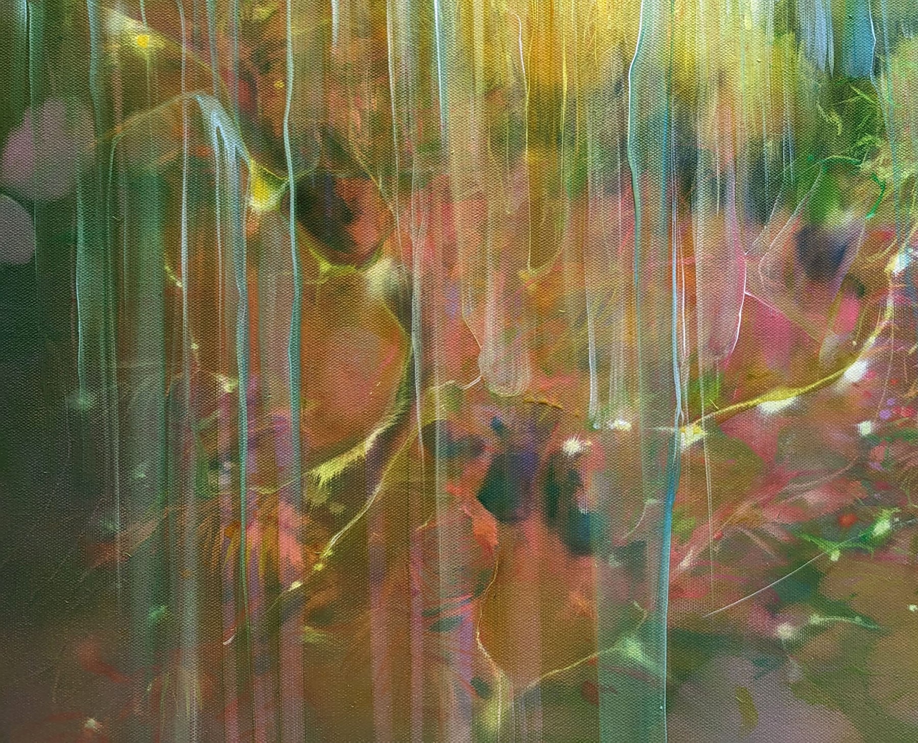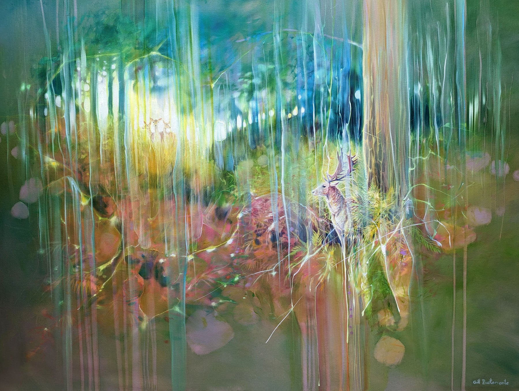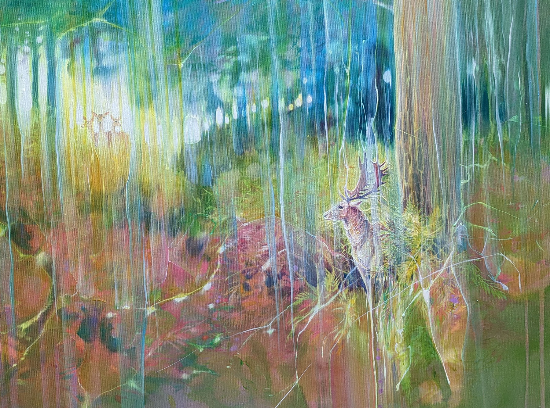 The Song of the Deer is a colourful semi abstract oil painting of a group of deer in an autumn wood. It is 40x30x1.5 inches. The painting shows a fallow deer buck next to a pine tree as he looks towards three female deer in a clearing to his left and above him. The painting is very colourful and has a slightly fairy tale feeling to it - there is clearly a story (or song) going on between the male and the female deer. The inspiration for the painting was a walk I took in Knole Park, Sevenoaks one autumn where there is a long grassy valley between heathland and forest where the deer can be heard calling to each other during breeding season. The stag in this painting is one I followed for a while up a slope through some ferns which were in full autumn mode of gold, orange and green. Behind him I could see a small bunch of females appearing and disappearing out of the forest and ferns and I felt happy to be witnessing a cycle of nature that is timeless and fascinating to see. It is painted on deep edge canvas, edges white, ready to hang and no frame needed. Comes with certificate of authenticity and gifts from the artist.