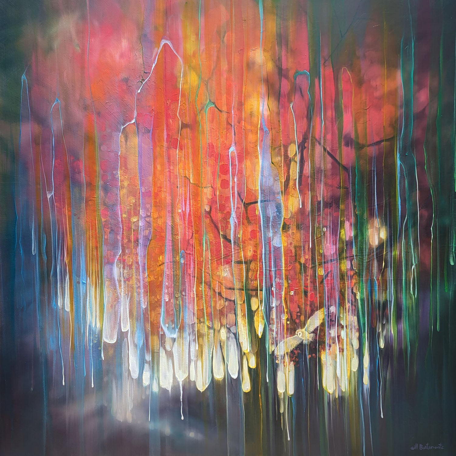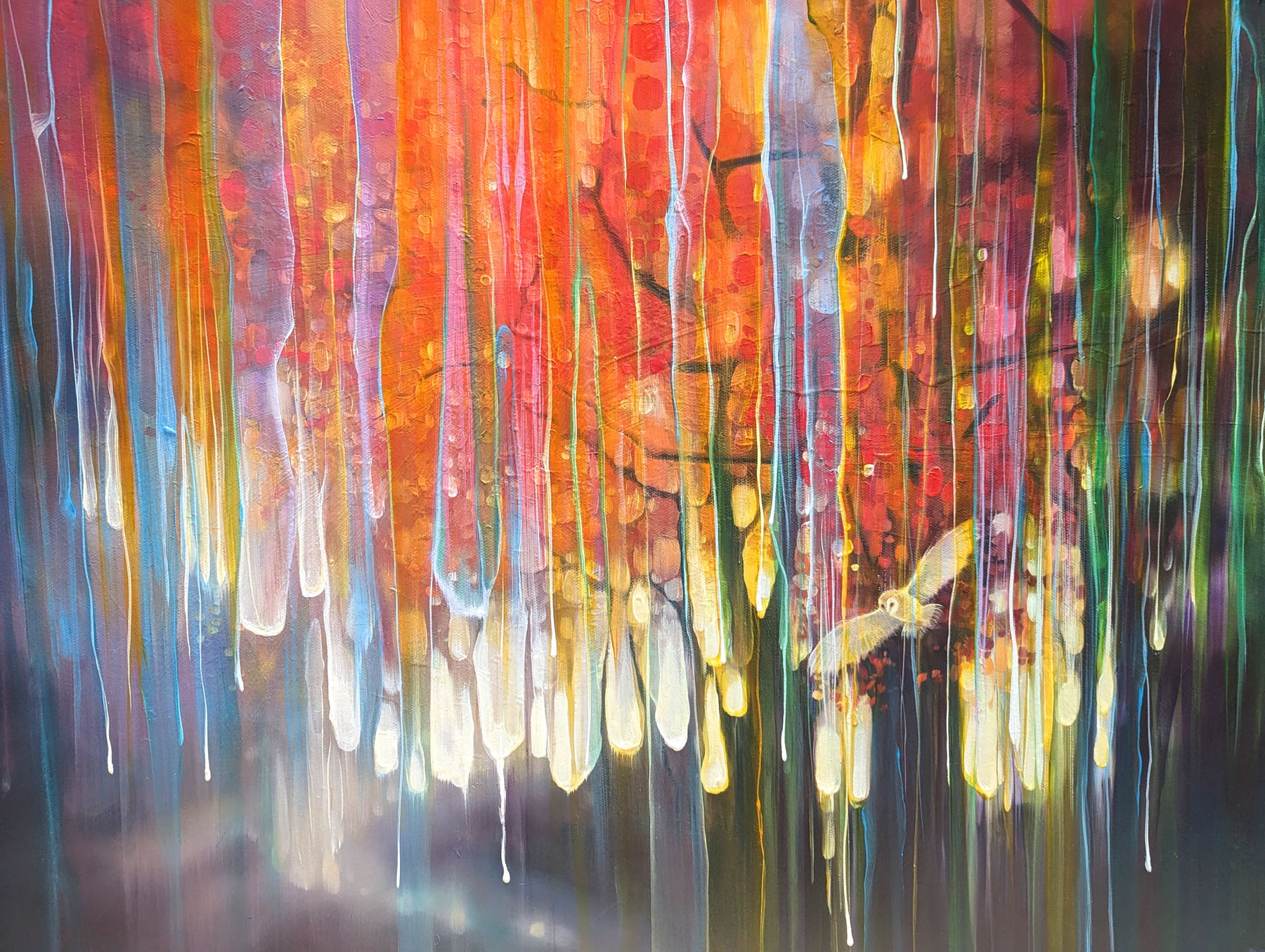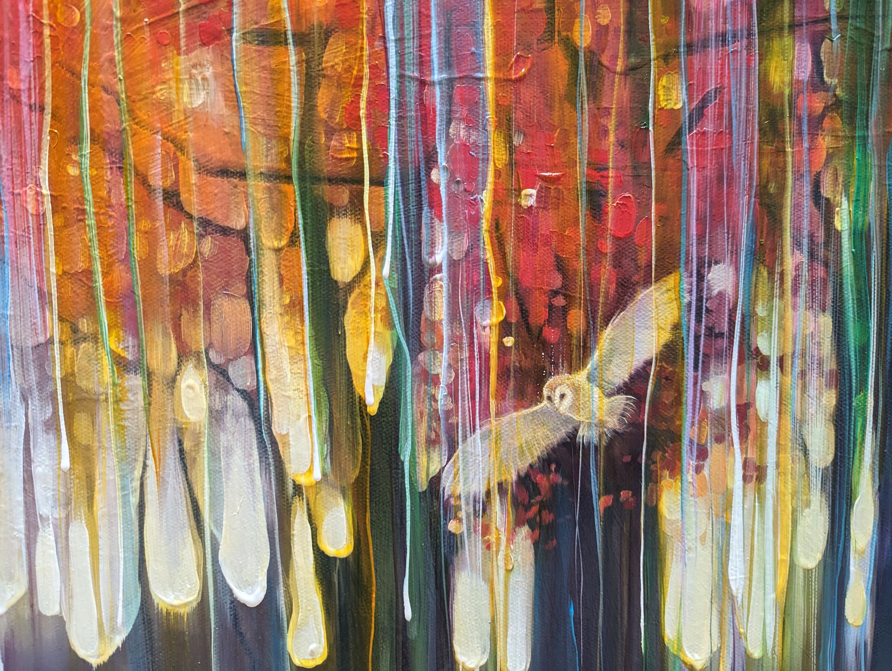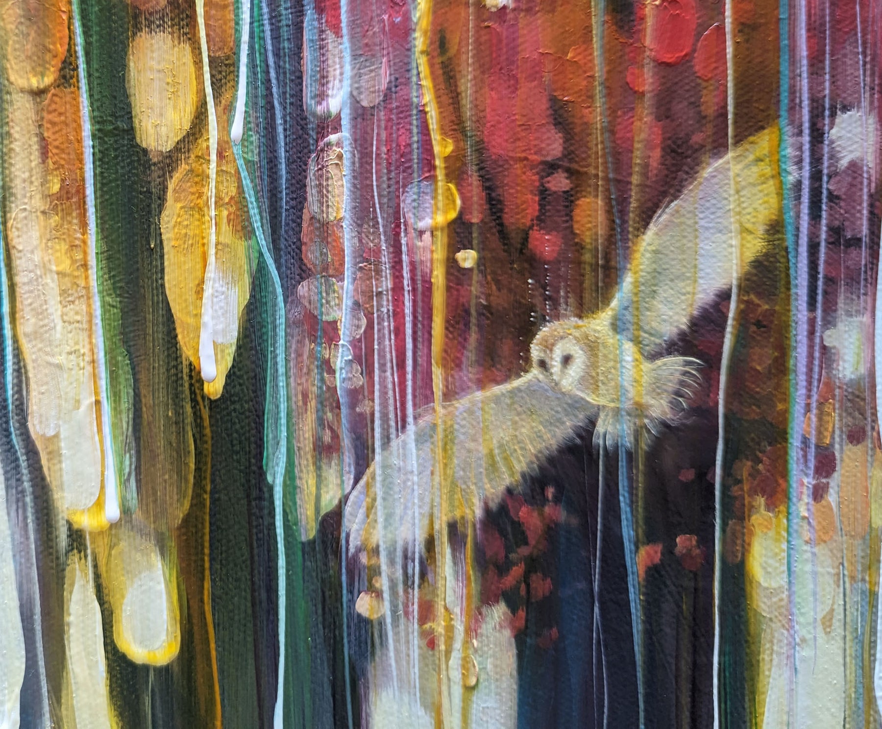 The Spell Caster is a warm, colourful autumn woodland path semi-abstract painting with barn owl. It is 30x30x1.5 inches. The painting is mostly orange and purple and though is clearly of woodland, it is built up with many transparent layers of rainbow colours and vertical marks and drips that give the painting the idea of it flickering in and out of a different reality. I find woodland magical and I find owls magical and I love autumn so this is the combination of those things. It was mostly inspired by some of areas of woodland around the Ashdown Forest in Sussex where you can go quite suddenly from a sunlight heathland into dark and sinister patches of dark forest. Painted on deep edge canvas, edges white, ready to hang, not frame needed and comes with a certificate of authenticity and gifts from the artist.
