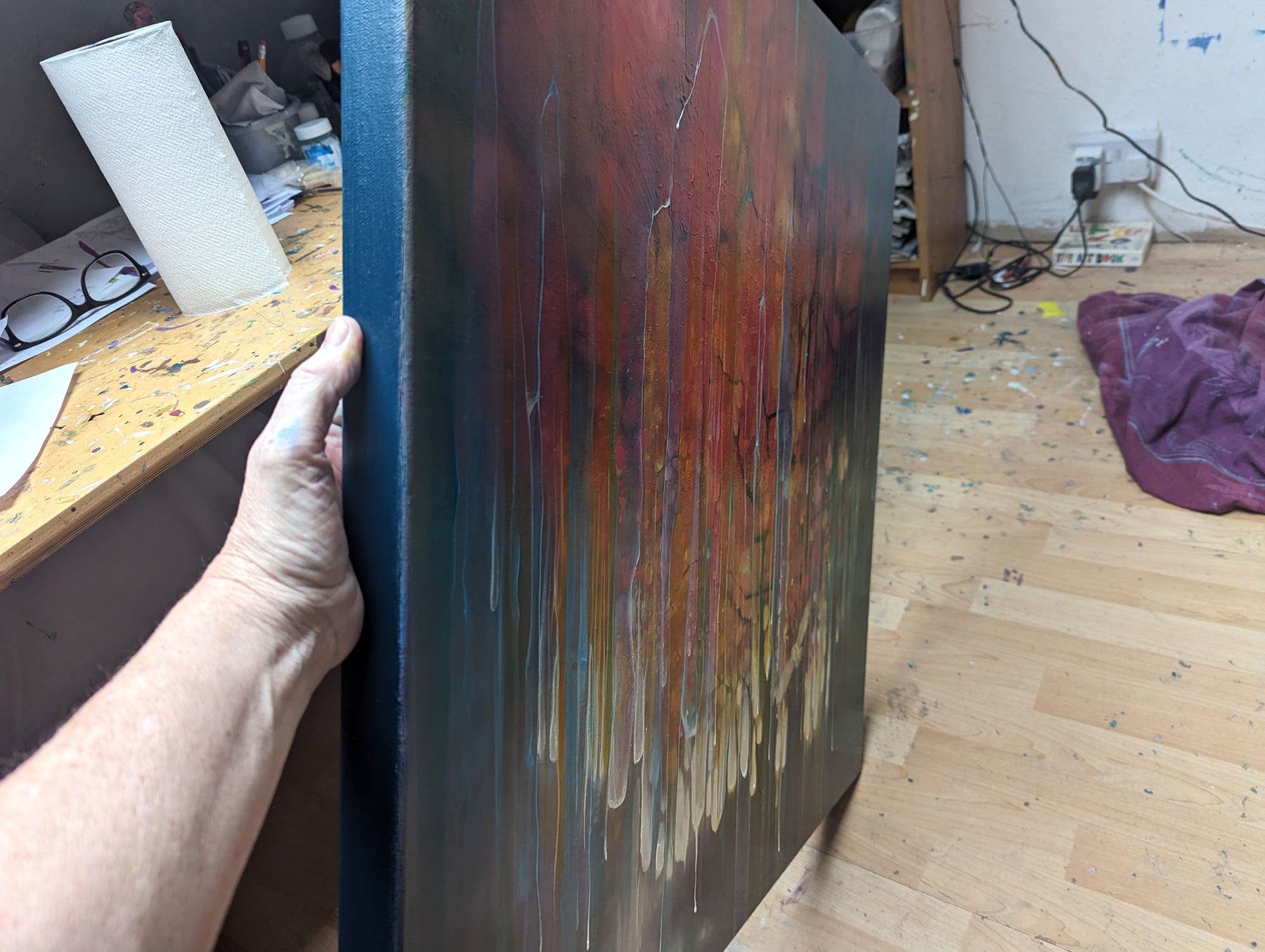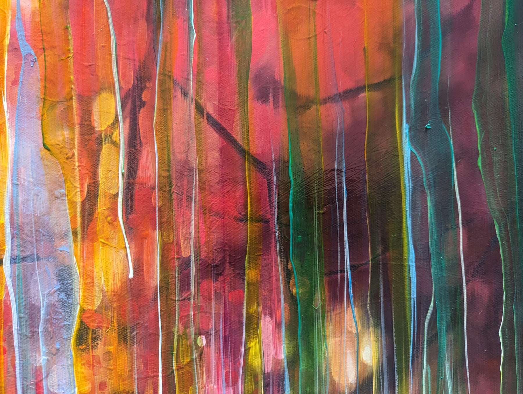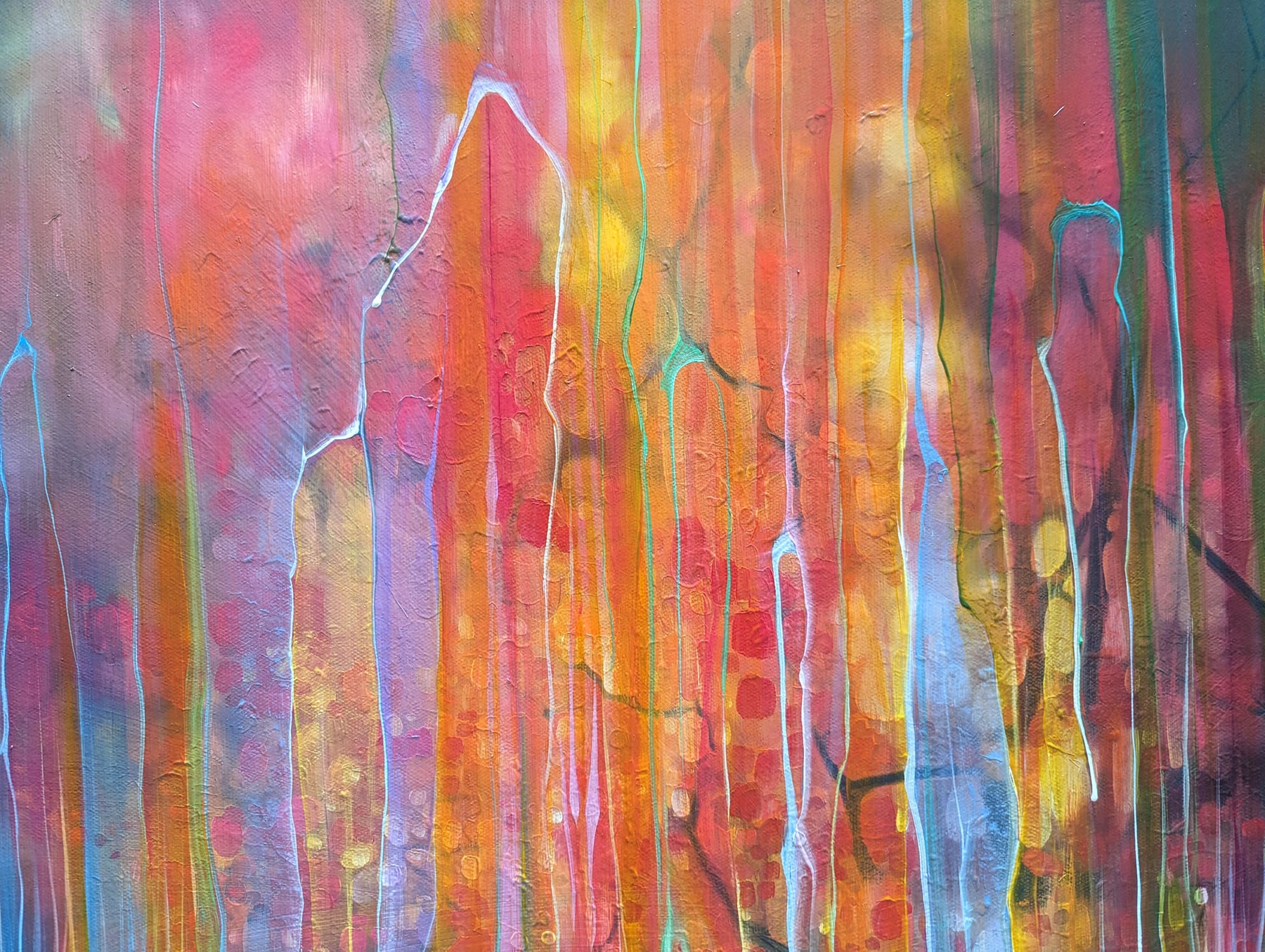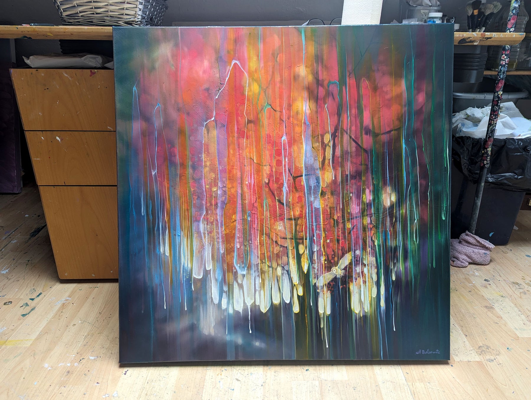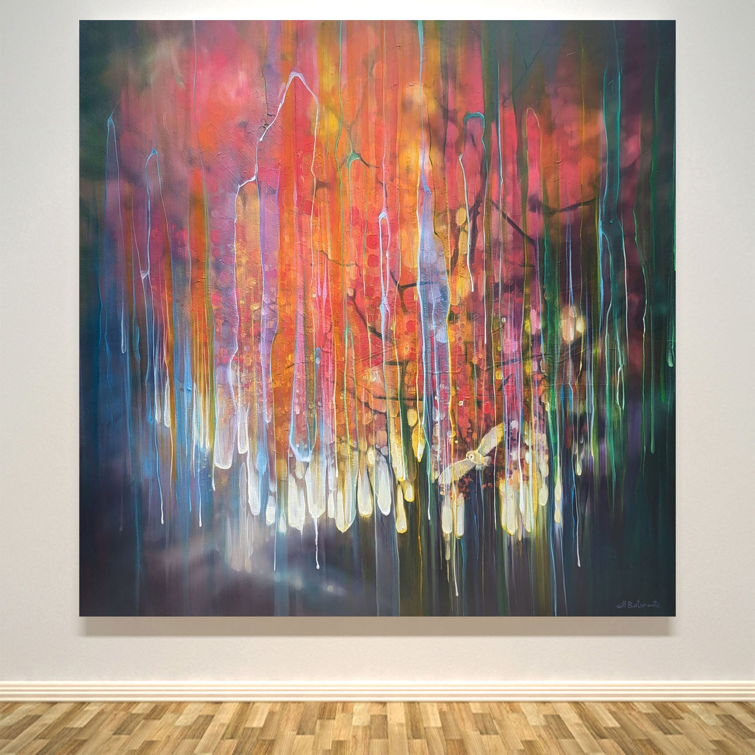 The Spell Caster is a warm, colourful autumn woodland path semi-abstract painting with barn owl. It is 30x30x1.5 inches. The painting is mostly orange and purple and though is clearly of woodland, it is built up with many transparent layers of rainbow colours and vertical marks and drips that give the painting the idea of it flickering in and out of a different reality. I find woodland magical and I find owls magical and I love autumn so this is the combination of those things. It was mostly inspired by some of areas of woodland around the Ashdown Forest in Sussex where you can go quite suddenly from a sunlight heathland into dark and sinister patches of dark forest. Painted on deep edge canvas, edges white, ready to hang, not frame needed and comes with a certificate of authenticity and gifts from the artist.