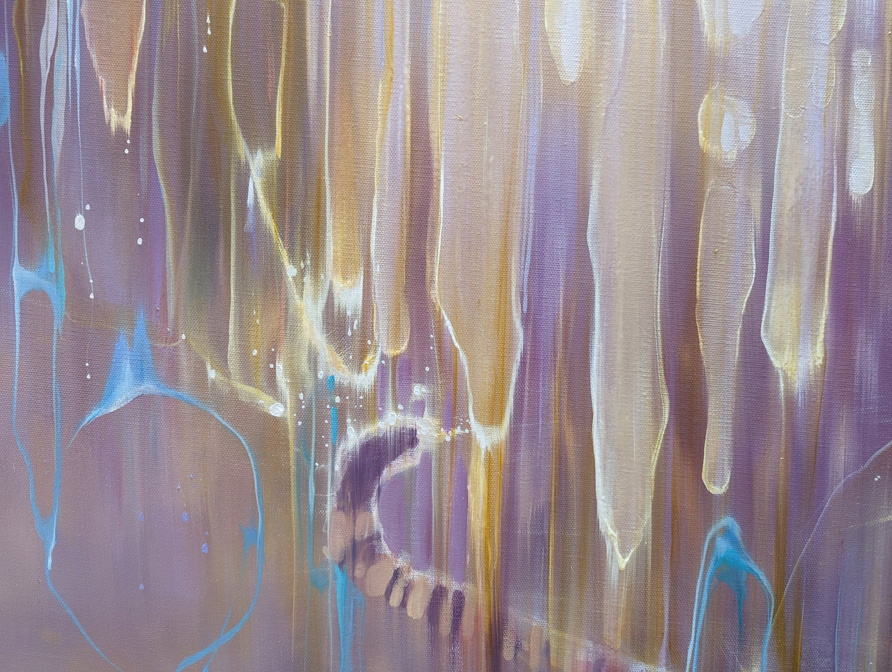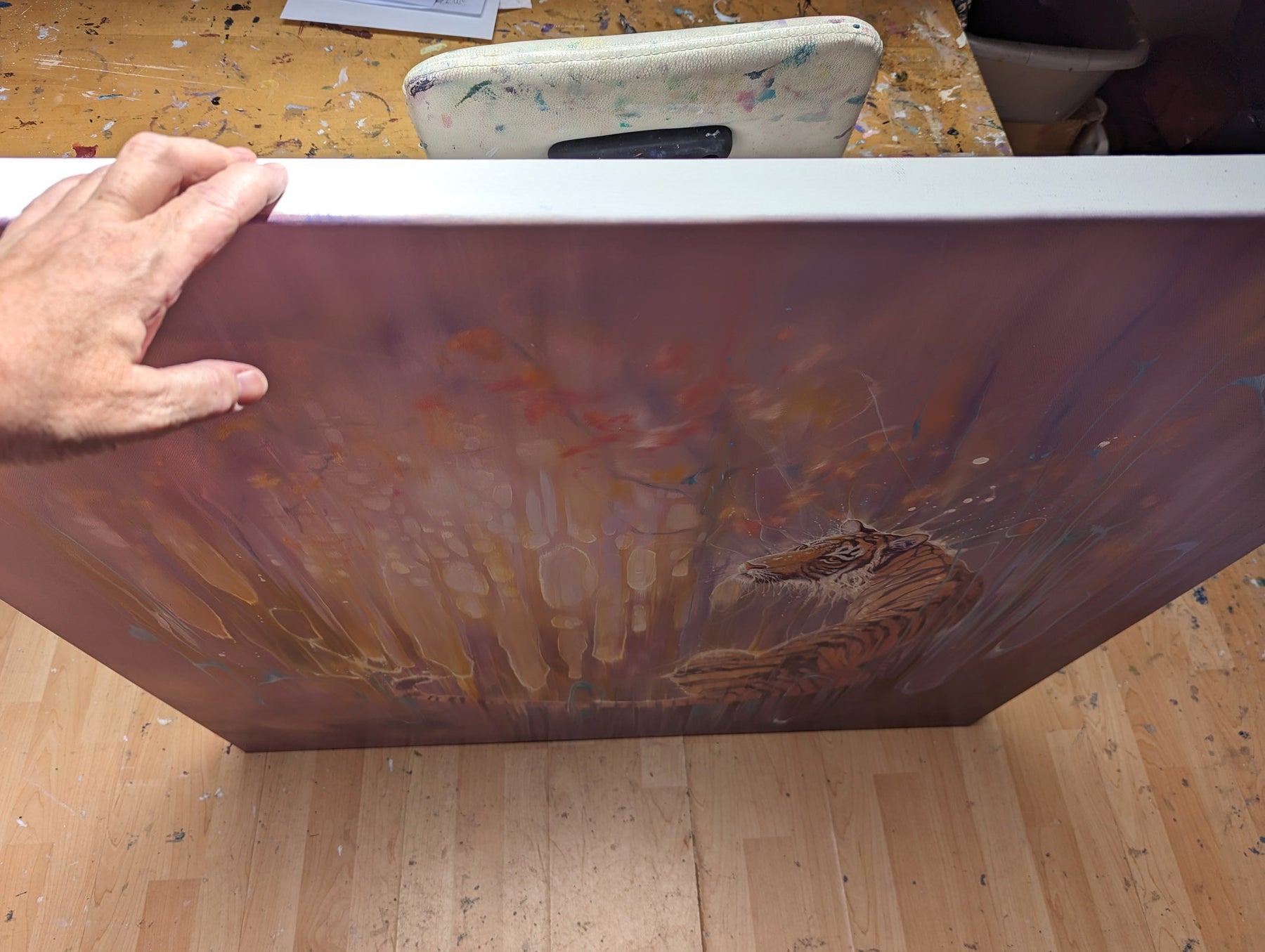 Tiger in the Ether is a 40x40x1.5 inches purple oil painting of a semi-abstract art-nouveau style tiger against an abstract background. The style is slightly art nouveau and makes use of the complementary colours of purple with yellow and orange with blue which makes the colours very vibrant and almost mystical. The background hints at trees and light behind them but is quite abstract. The tiger herself has a pensive expression and looks kinder than most tigers. She appears to be dissolving into the ether (ether being a spiritual idea) and has sparkles of light or energy flowing out from her. In reality, tigers really are in danger of dissolving out of existence so the message is quite poignant. Painted on deep edge canvas, white edges, ready to hang and comes with certificate of authenticy and gifts from the artist.