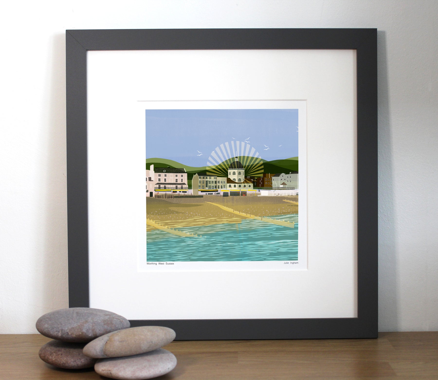 Worthing Dome: this Giclee print is beautifully printed on Bockingford Watercolour 190gsm Paper, using ChromaLife 100+ quality ink. The print is window mounted using an off white shade of mount board. The window size of the mount is 20cm x 20cm. Framed using a high quality classic grey frame. With shatterproof styrene glazing. The external measurement of the frame is 36cm x 36cm. Frame width may vary slightly from image. Framed prints are posted in tissue, bubble wrap, card and brown paper to allow for safe delivery.