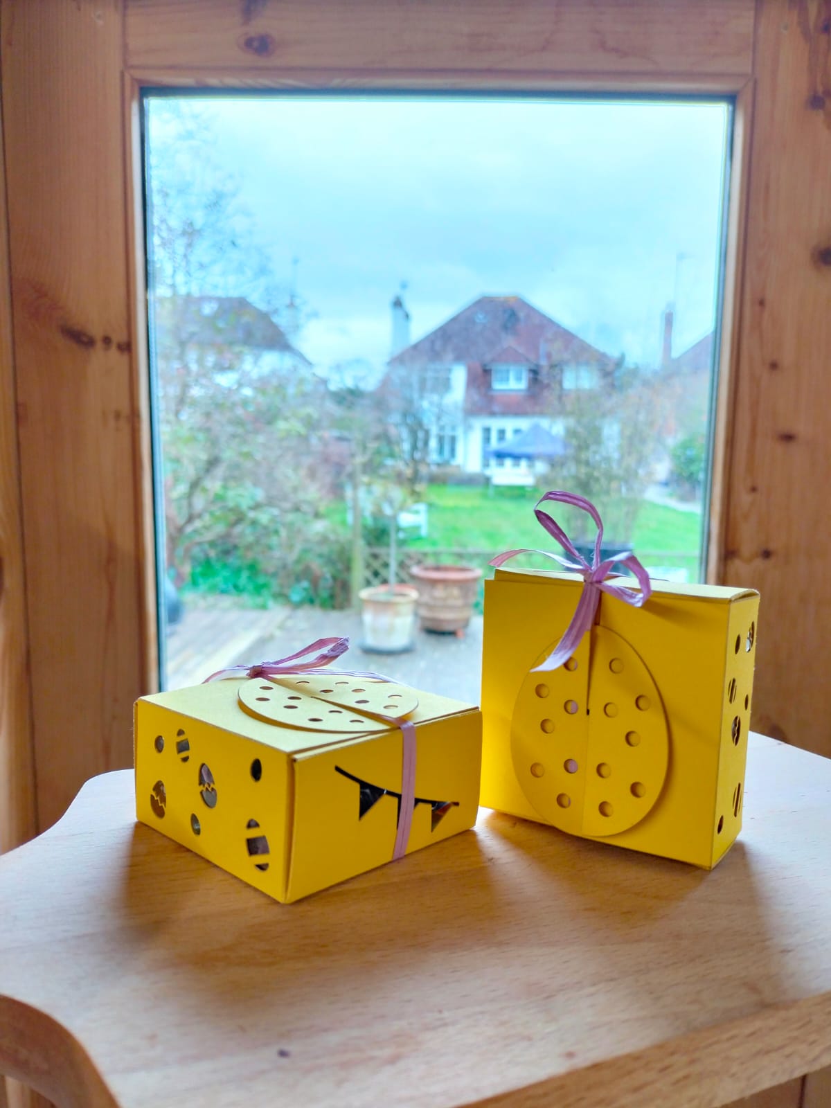 12 mini egg halves are packaged in a compostable bag inside a little laser-cut Easter gift box.