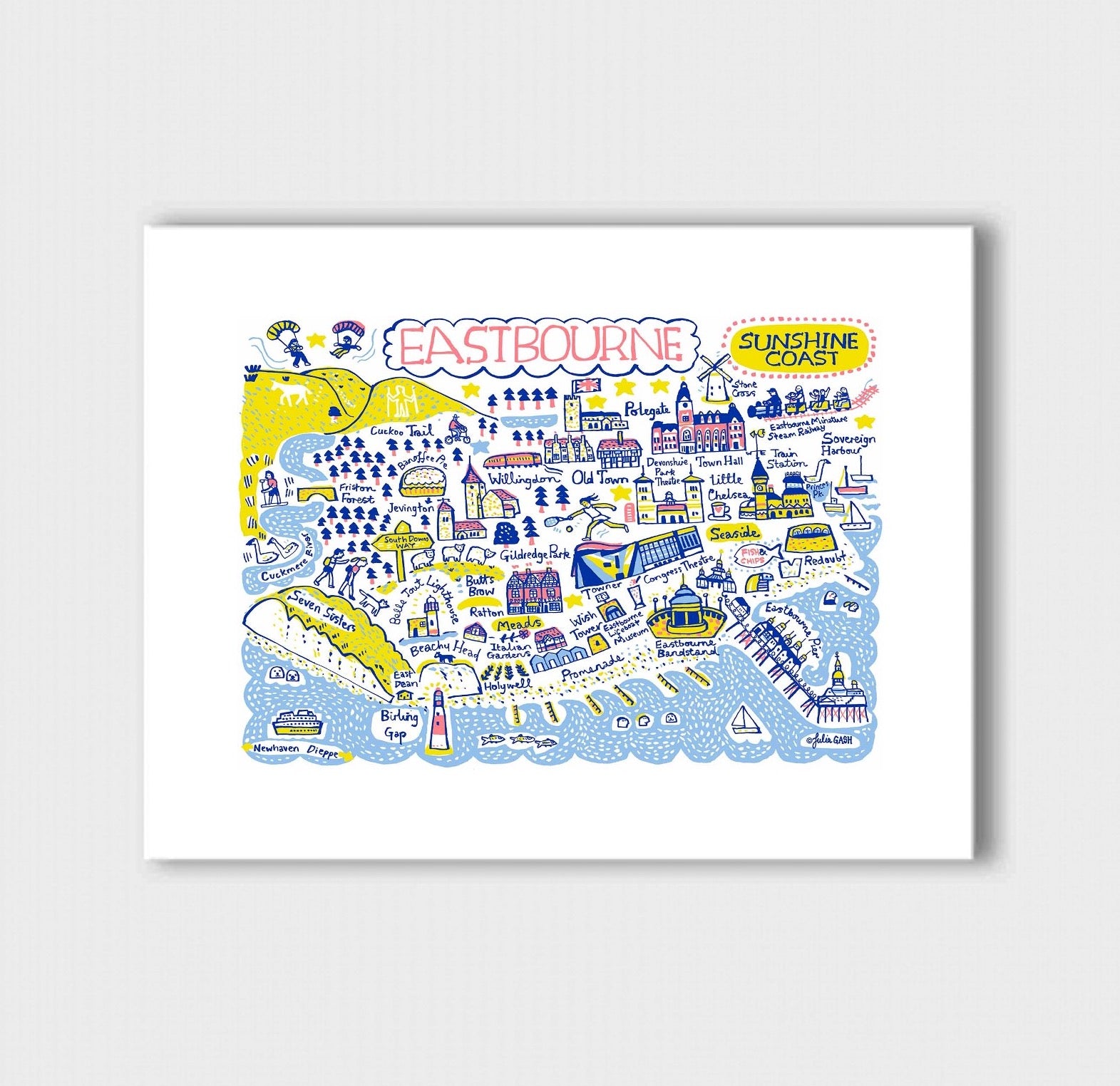 Eastbourne, my home town for just over a year now. I absolutely adore walking on the South Downs, which therefore features heavily in my illustration of this Sussex seaside town. Acknowledged as the sunniest town in the UK, Eastbourne has a beautiful pier and pretty promenade where I can often be found … promenading, after a day at my drawing board! Banoffee Pie was invented in nearby Jevington (Mmm!) and the town is known for its tennis tournaments and theatre productions which feature in my design too. Hello Sunshine Coast, Hello Eastbourne. :-)