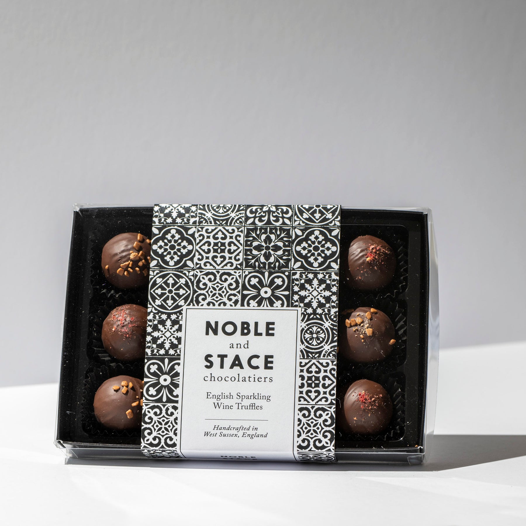 A collection of 12 fresh cream and milk chocolate truffles blended with award-winning Sussex Sparkling Wines from Ridgeview Wine Estate, Wiston, Kinsbrook or Bolney. Each truffle is hand coated in dark chocolate before being decorated with raspberry powder or milk chocolate flakes.