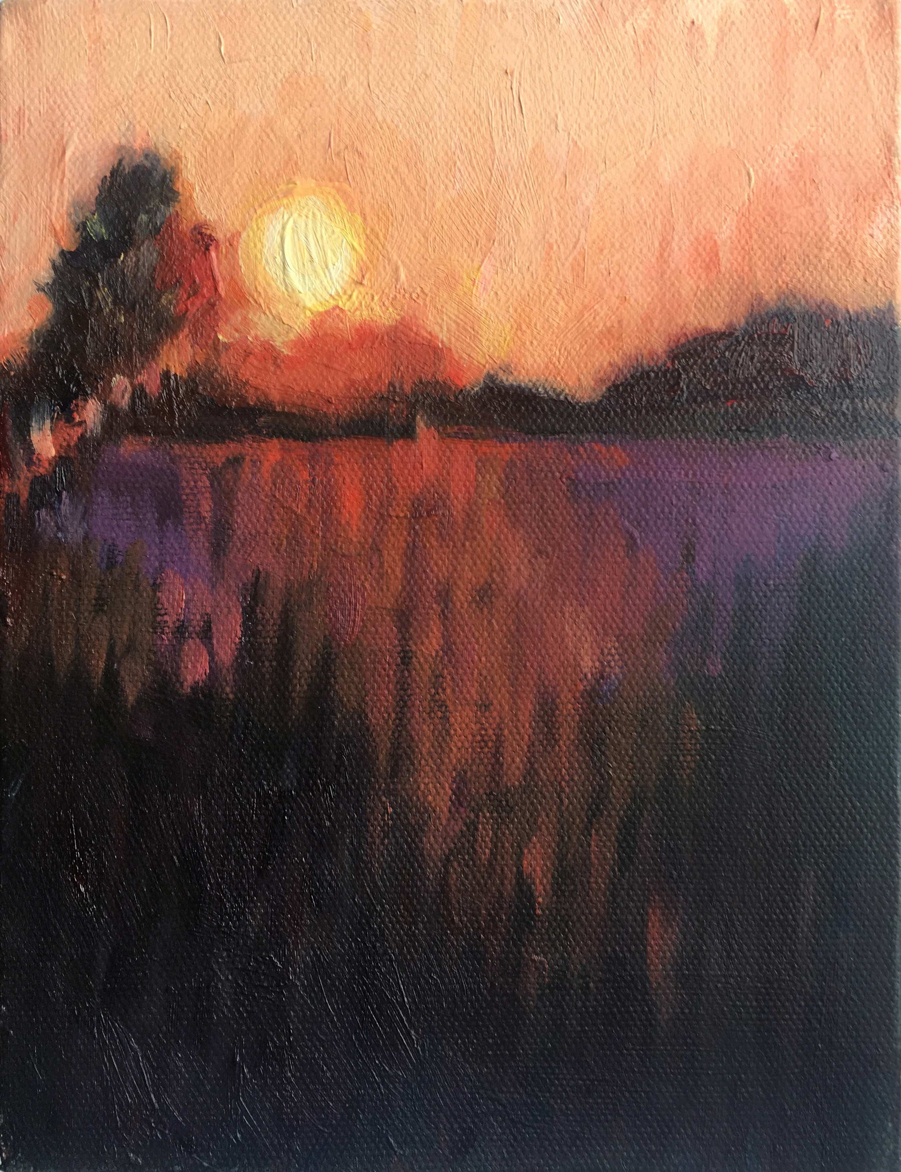 This original painting I began in acrylics and later added accents and passages in oils. The touches of paint are reminscent of impressionist landscapes - using small daubs of colour to bring out the rays of dying sun over the fields and trees.